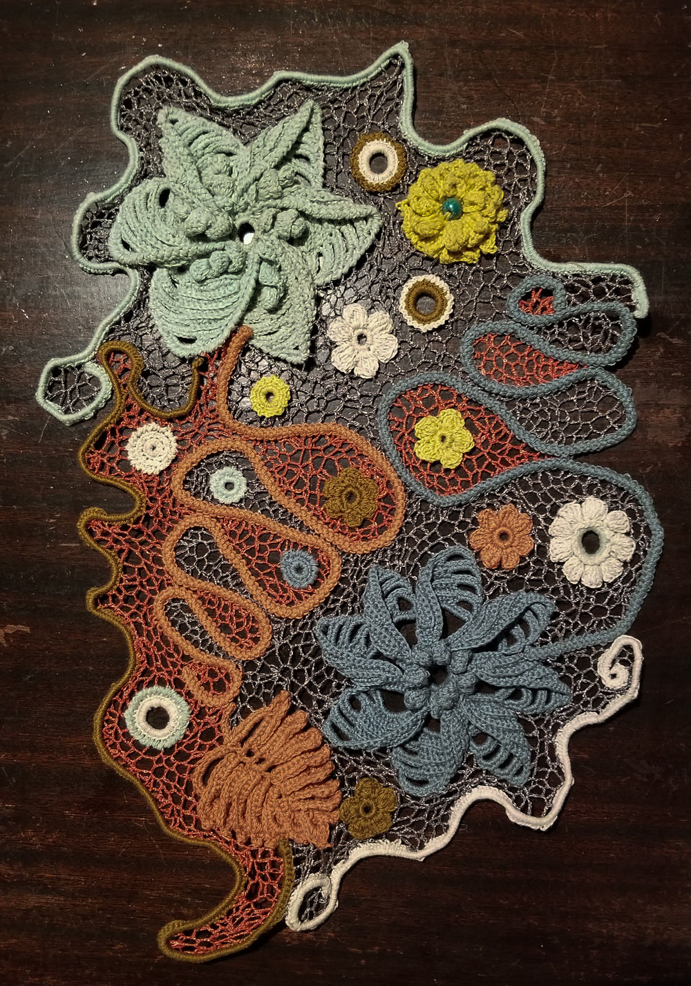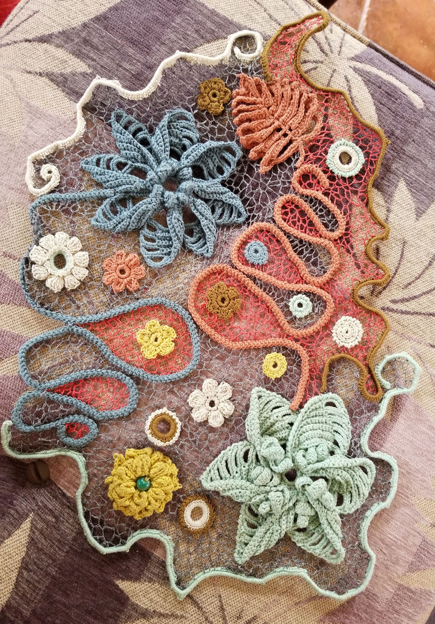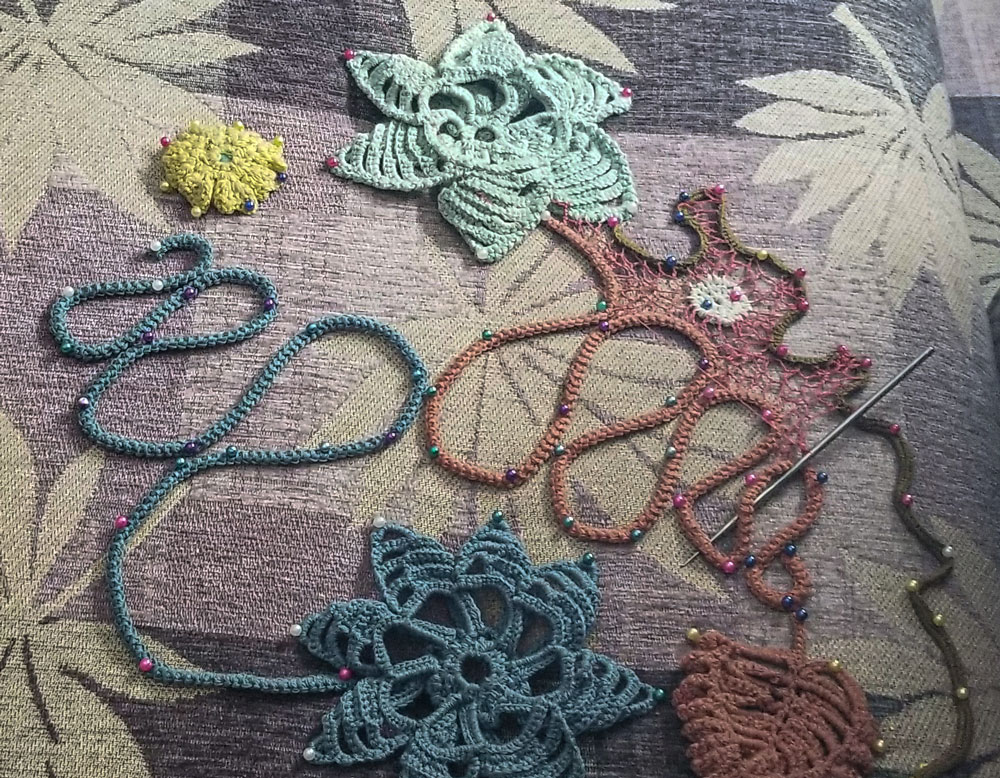 OK, I have to do something about that itch, it’s getting bad! I started by finding a YT video to crochet along (I believe from Elena Rugal, in Russian) of a pretty flower and a leaf, and there was a nice set of six different pastel colors of cotton yarn on the cone, which was just slightly thicker than size 10 crochet thread, although not mercerized. I only used one larger bead for a small flower, since my mom is making jewelry and has a bit different beads that those I’d use in my crochet projects. When I completed several pieces, I tried to find the thinnest thread that isn’t going to easily break: therefore it would likely not be cotton. I found some shiny soft red and gray likely poly thread, and used that. It was very thin, so it produced rather nice, fine webbing. It made me think of using shiny polyester embroidery thread for webbing in future projects, as it seems hard to find size 30 crochet thread in any color but white and cream. What you see below is the work in progress, with motifs facing down for easier crocheting of the web.