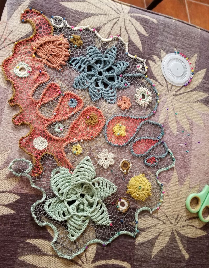 This project was completed in May of 2024, when I was visiting my parents in Serbia. My mom has a huge collection of yarn, and I usually just can’t help myself but keep those hands busy. The couch we sit on in the lounge area upstairs has cushions that are not affixed to the frame, and I thought to myself that those were just perfect for making Irish lace: pinning the crocheted motifs and crocheting the webbing between them.