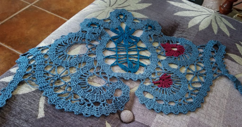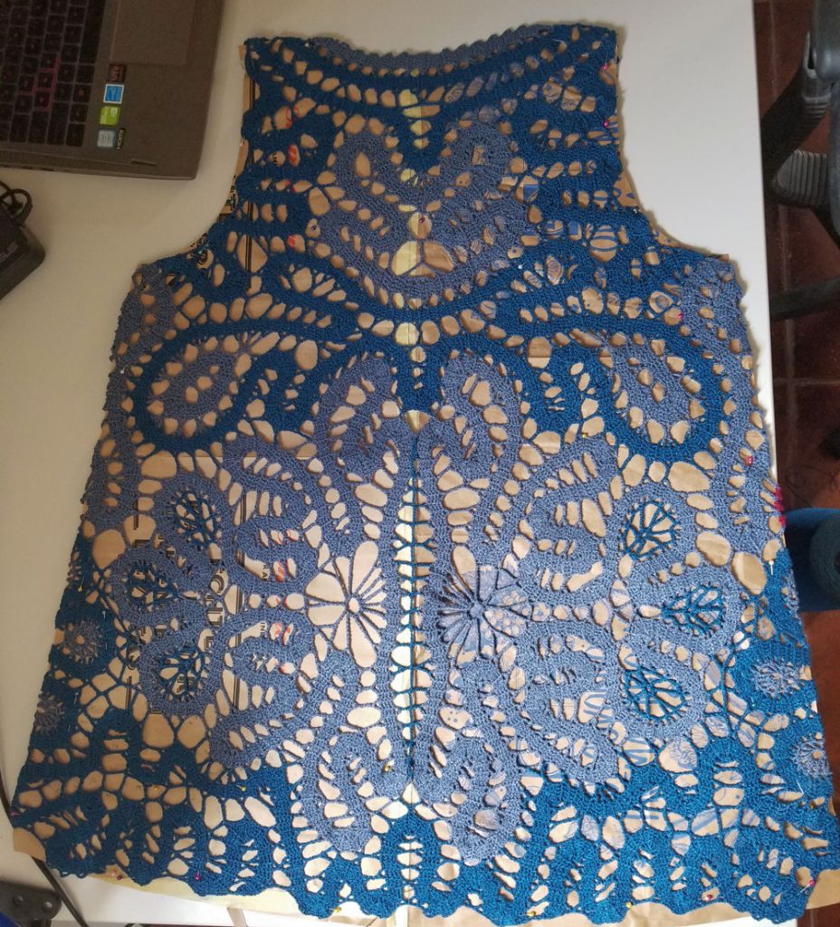 As you can see, I planned out where the strips would go by drawing them on the paper and using the drawing as a guide. The red flowers were not included in the end, since the red yarn was a bit thicker and I didn’t feel like using it anymore, plus it isn’t quite right to crochet connections between sections apart from the winding strips: they can look awkward and out of place, and the only areas where I had that was in between the big front motif and the two mirrored motifs on the back. Ideally, the connections between those would be made as part of the two mirrored motifs, and not separately. Here’s the completed work: