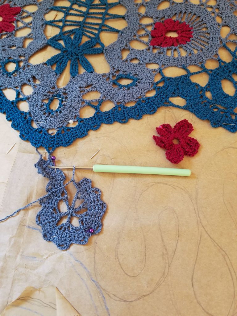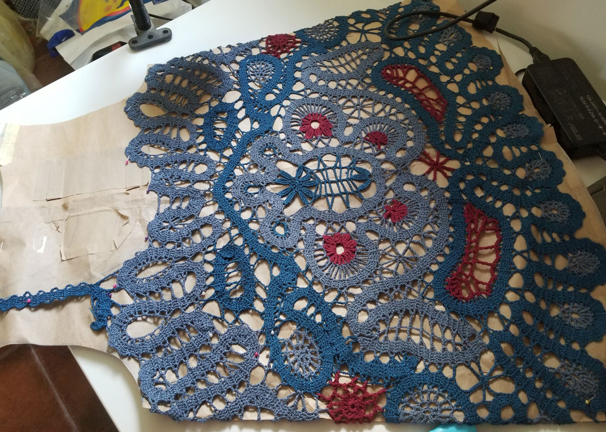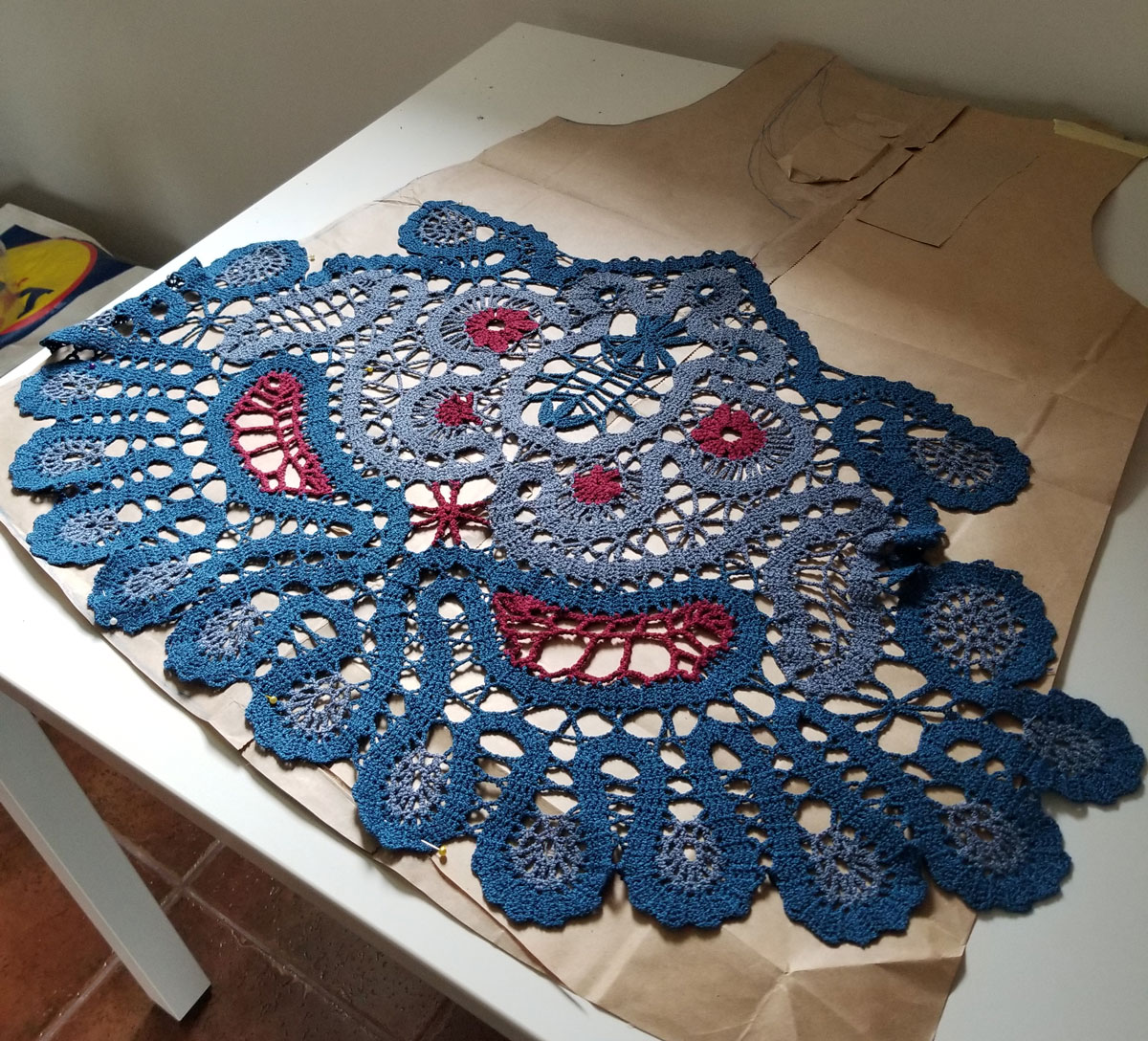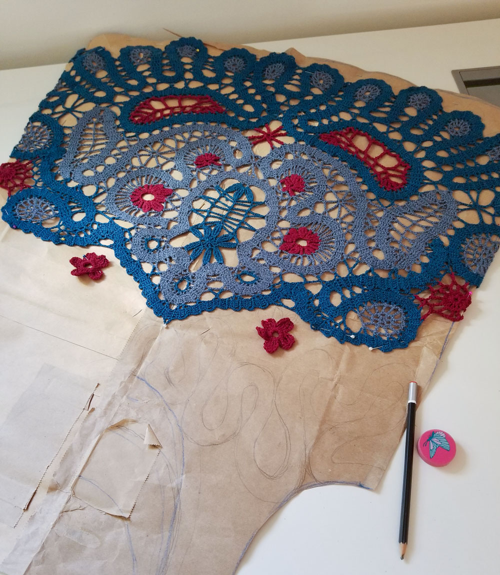 As you can see, the motif from the front side is getting wrapped around to the back side and it’s pinned onto the paper. I realized that the only way to continue is to begin making up my own design, so that I can fill in the rest. Since everything was mirrored across the center, I would have to replicate the left side over to the right, or vice versa. What I ended up doing to ensure symmetry was writing down onto the paper pattern the number of chains or crochets that were used to connect the winding strips. The basic pattern for strips is always the same: 4 double crochets, five chains, turn work around and repeat. In cases where the strip is making a turn and/or connecting to already completed sections, the middle of 5 chains would be instead a crochet (single, double, triple, quadruple etc), which is what I would write down, as it could be hard to tell if a connection is a double or triple crochet. Another thing that I quickly realized was that this improvisational work really needed to be done in a pin-along fashion, with completed parts steam ironed, pinned down and fixed, and work in progress being pinned down as it was completed, because otherwise there was a risk of creating sections that would be bunched up or too stretched. The middle image below shows how soon I would insert the pins into newly completed strip: