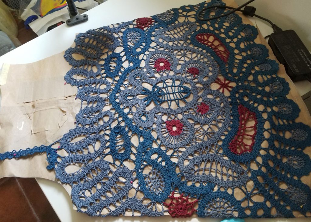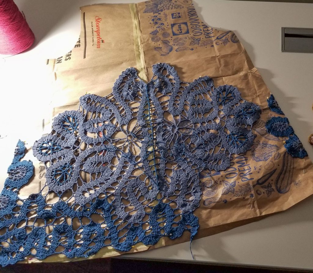 While I was visiting my parents in Serbia, I decided to give this style of crochet a try. I was looking online at Russian magazine Duplet, full of beautiful crochet with schematic patterns, which I love, since I have a hard time working with American style written crochet instructions full of acronyms – that does not work for me. After browsing Дуплет Брюггское кружево I got inspired to give it a try, as I’ve never done Bruges lace crochet before. I didn’t immediately know what it was going to be, but I picked the rayon (viscose) and cotton blend thread that has a nice weight to it and drapes beautifully. After completing the first motif, which was supposed to be just a section of a larger doily, I did not feel like stopping, as I got into the swing of things and it was fun, so I figured I would make a tunic out of it. Then, I made a pattern on joined paper bags, based on my measurements and length that seemed appropriate. Here’s what that looked like: