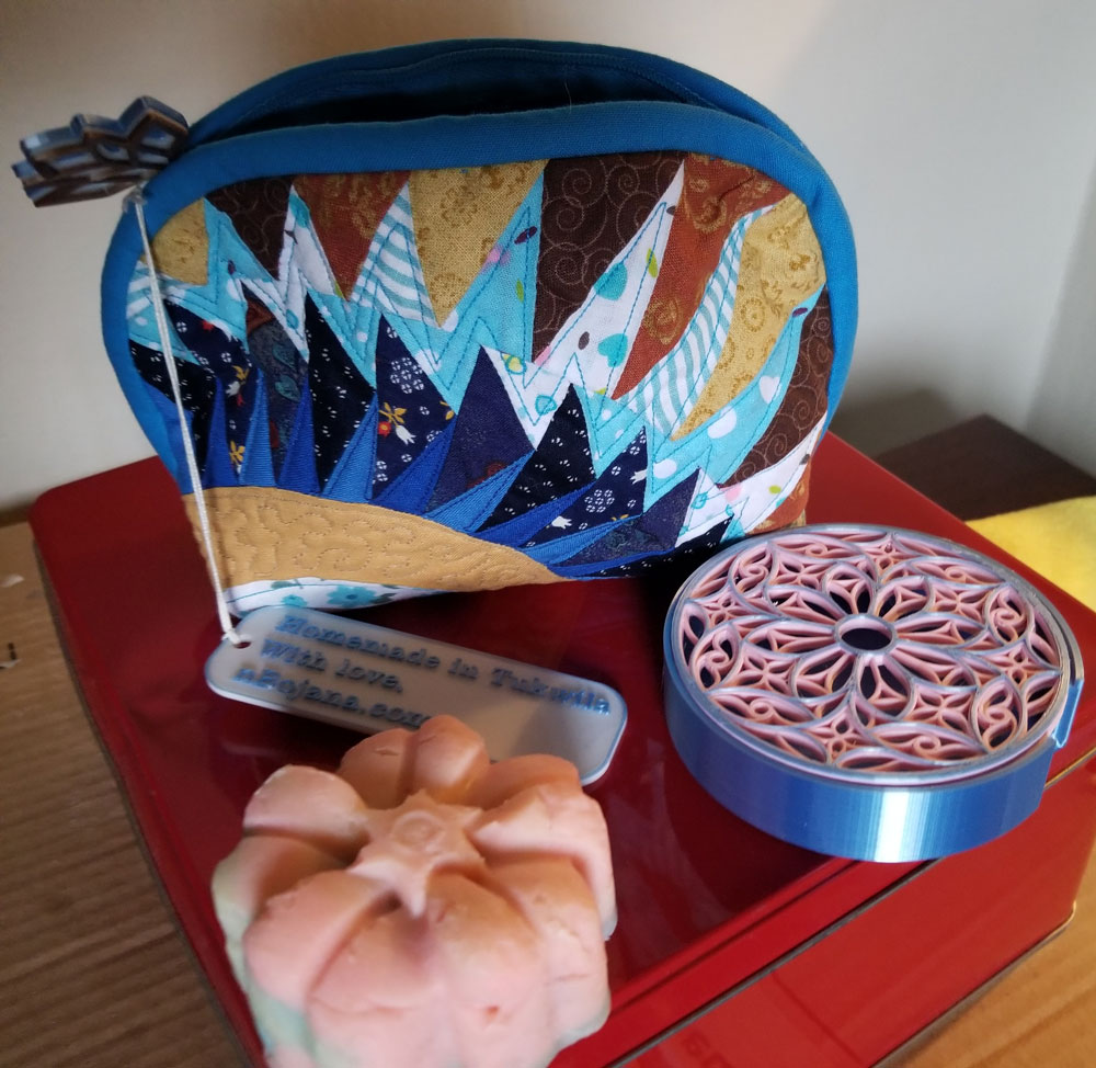 I’m not going to write much about these pouches, because I’ve already done similar projects and written about the process in depth. I made these two pouches as Thanksgiving gifts, and they came with a 3D printed rosetta soap dish, a flower shaped homemade soap in pink and blue, and a 3D printed tag. For the darker blue/red pouch I only have a single picture, since it was given away right after it was done. The other side of it also has partial circles without the FPP New York Beauties patchwork. We were about to move to a different house, and I had a few days of downtime before packing began. As soon as I was done 3D printing and sewing, the printer and sewing machine got loaded into the van along with a whole stash of fabric and filaments. “The stuff owns you” phrase never seemed more true than during the move!