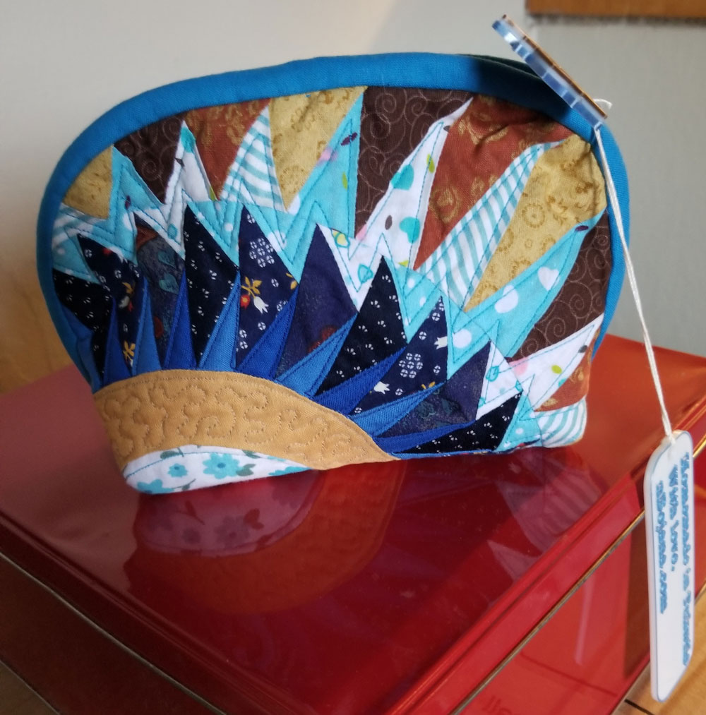 Unfortunately, these turned out a bit smaller than I wanted them to be, since I started with a saved pattern I thought was the correct size of Cleopatra’s Fan Cluth, but turned out to be just a sized down guide for piecing, and not the actual pattern I should’ve used for the outline. In fact, I should’ve just made all new outline (it’s just a rounded corner rectangle, for Pete’s sake!) measuring at least 8″ for the width of the pouch, but c’est la vie. It was just one of those wtf brain farts and that’s all there is to it. The toothbrush doesn’t fit into these pouches, but at least soap and the dish fit just fine. I would like to make a few more similar pouches, because I got a different, lightweight fusible fleece and want to see how that works for pouches and shopping bags.