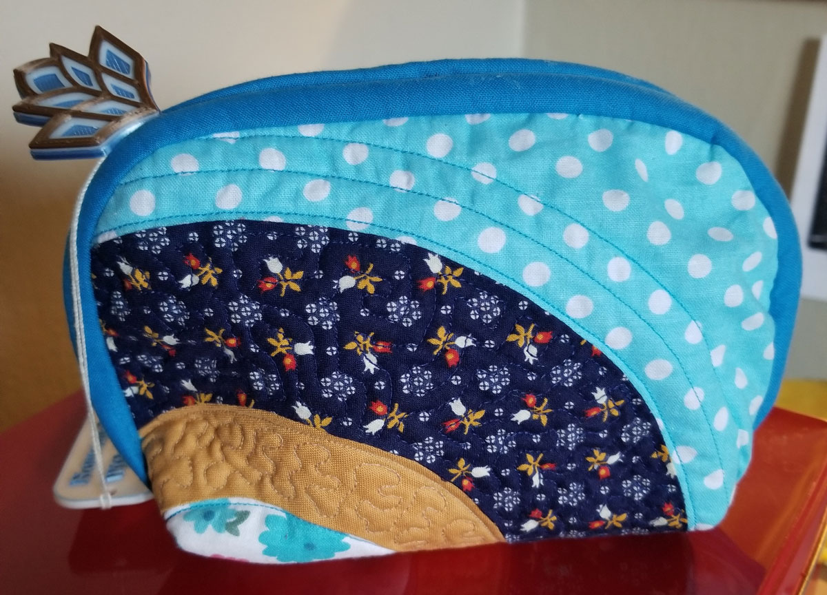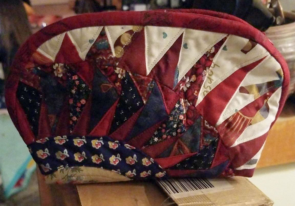 Unfortunately, these turned out a bit smaller than I wanted them to be, since I started with a saved pattern I thought was the correct size of Cleopatra’s Fan Cluth, but turned out to be just a sized down guide for piecing, and not the actual pattern I should’ve used for the outline. In fact, I should’ve just made all new outline (it’s just a rounded corner rectangle, for Pete’s sake!) measuring at least 8″ for the width of the pouch, but c’est la vie. It was just one of those wtf brain farts and that’s all there is to it. The toothbrush doesn’t fit into these pouches, but at least soap and the dish fit just fine. I would like to make a few more similar pouches, because I got a different, lightweight fusible fleece and want to see how that works for pouches and shopping bags.