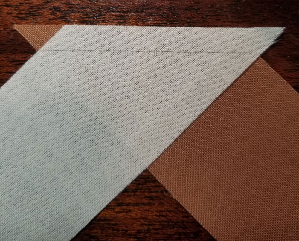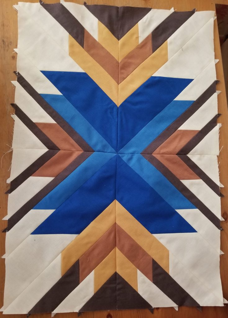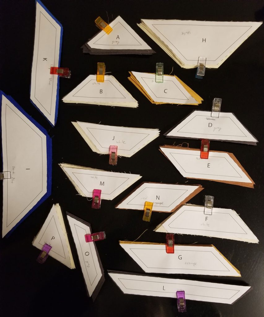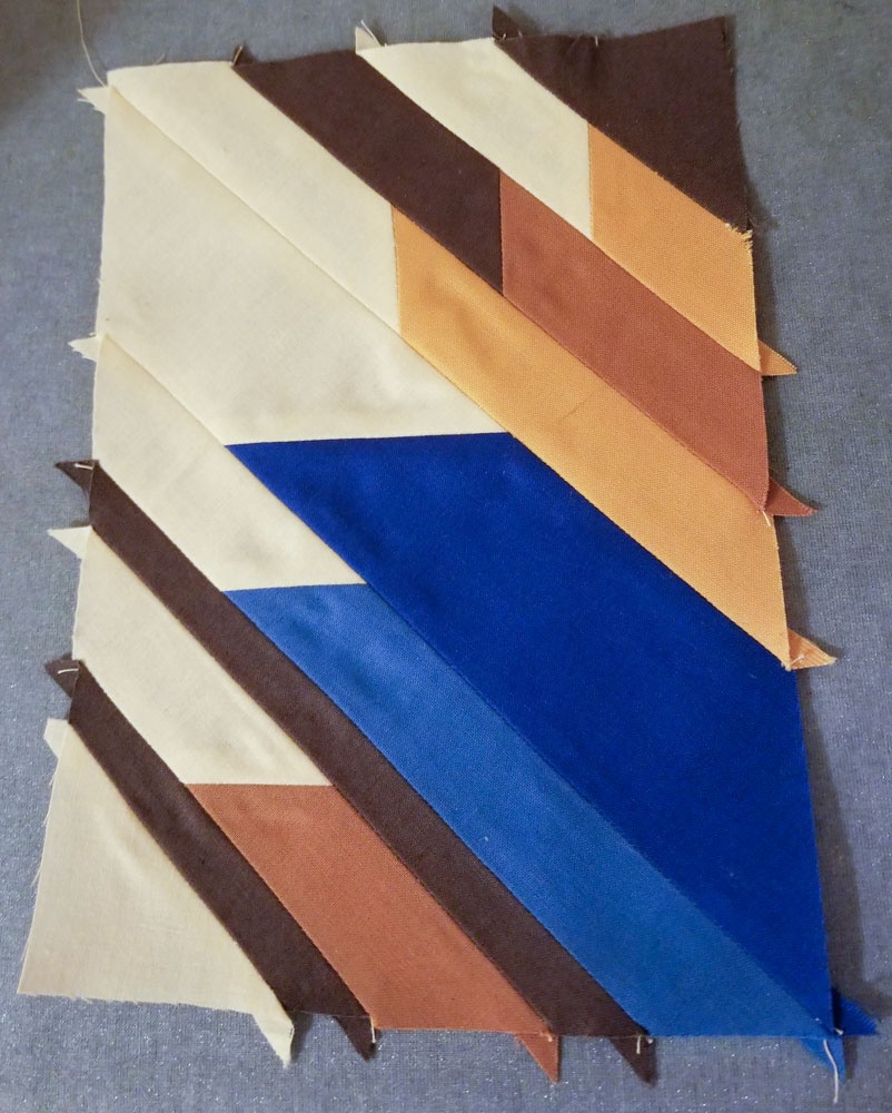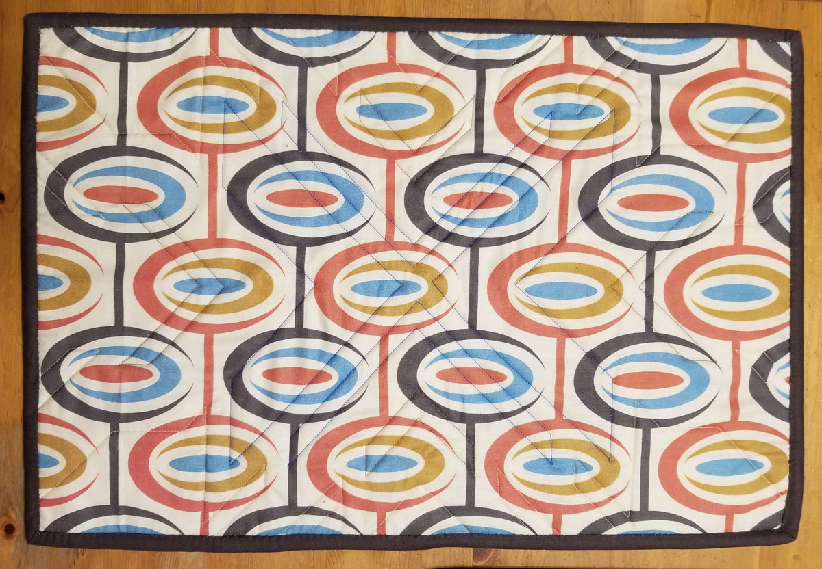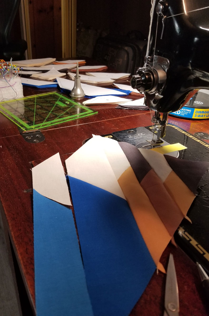 The top right design won, thanks to a few more votes from the family members. I made a pattern for it and printed it out. I thought I would be able to come up with a shortcut where different colored fabrics are joined together first and then the strips were cut, but gave up on that, because I would end up with right triangles of discarded fabric as a result of 45° angle of the seams. Since all the strips are 1/2, 1 or 2 inches wide (plus half an inch for seam allowance), I would cut the strip first and then use the cut out pattern as a guide to place the ruler and make the 45° cut. In the first image below you can see how this resulted in stacks of pieces of strips. For 4 placemats, I needed to have 16 pieces of each patch, and because all the fabric I used was solid color, all these pieces are the same. If I were to use print fabric, I would need to cut 8 pieces with pattern right side up, and 8 pieces with right side down. In the second image, you can see that I drew a line at a quarter inch from the edge so that I could precisely align the fabric, but I did that only in the beginning, because I realized that I can eyeball this and the piece of marking tape I have on the machine (seen in third photo) was sufficient to help me check that the seem is going to be in the right place. Not drawing the line sped up the work significantly. Further down, you can see the progress of piecing. Each placemat had two different pairs of quarters and once they were done, the trickiest part was to connect them all together so that in the middle 8 seams are coming together in a single point. I would use pins to ensure the seams are aligned. I chose the backing fabric that had similar colors to the patchwork, and so we can flip the placemats around if one side becomes dirty, or boring.