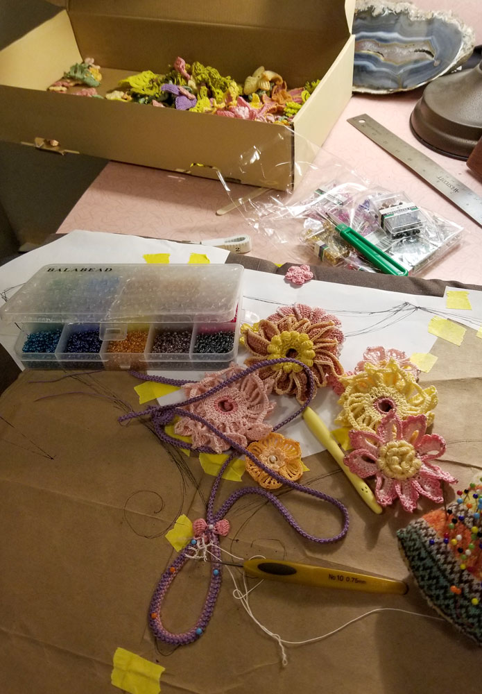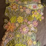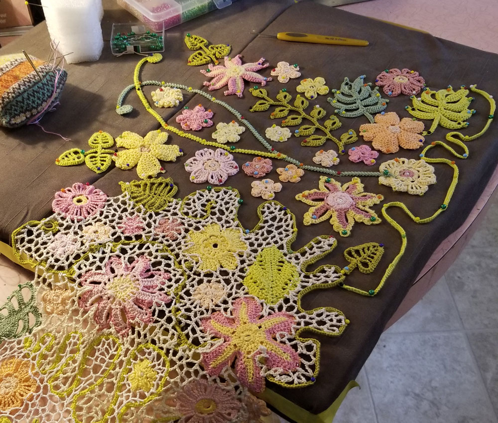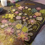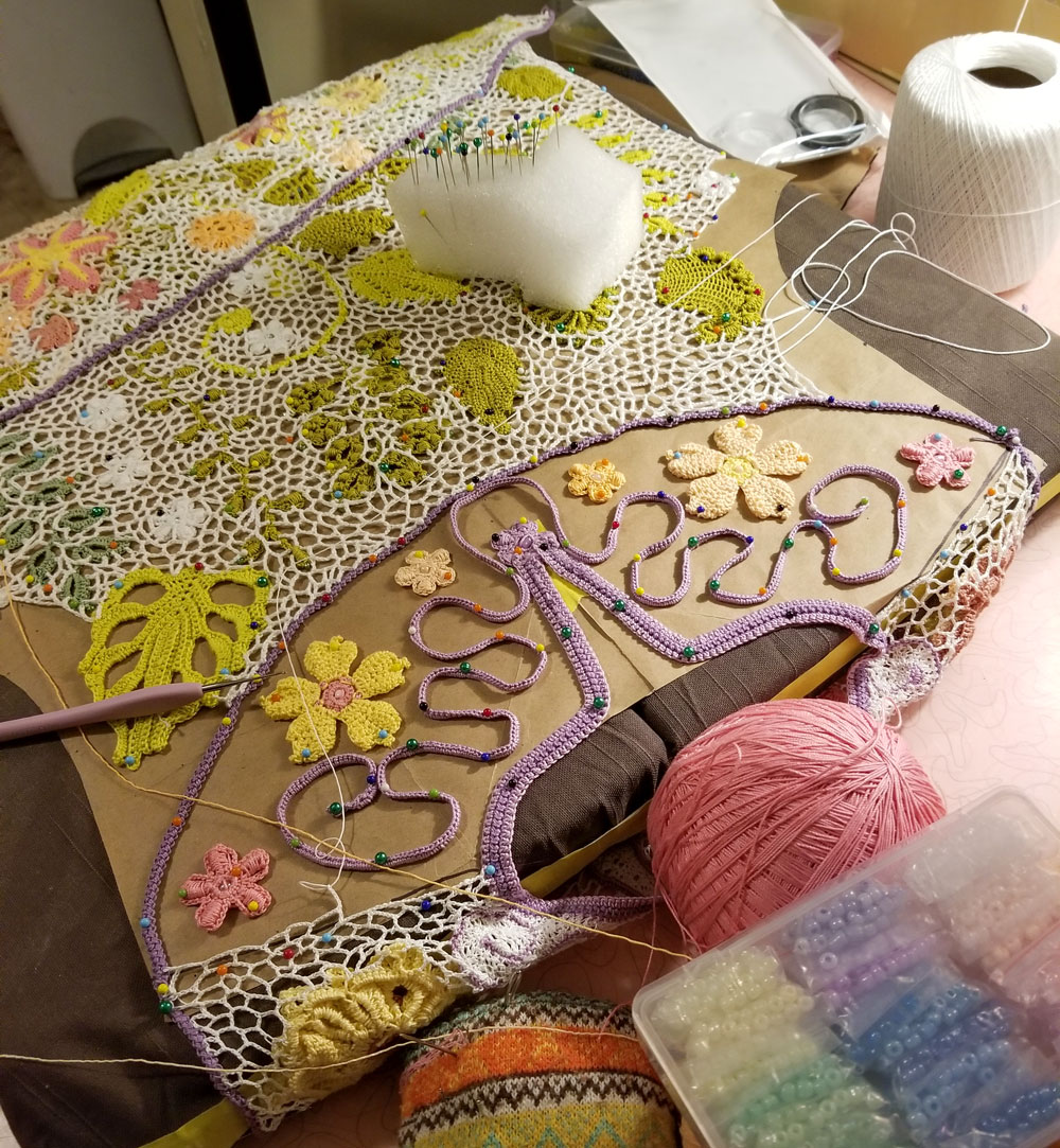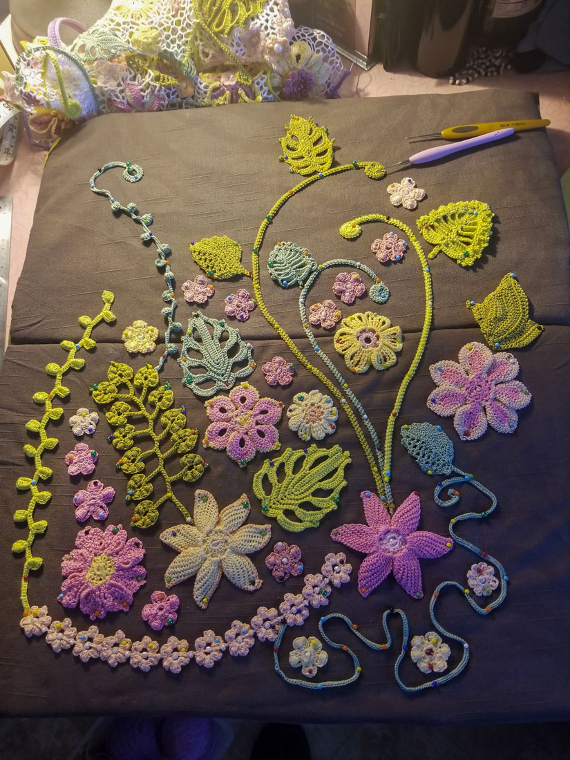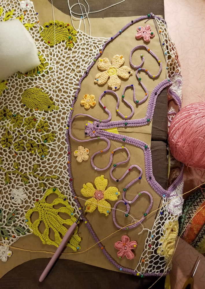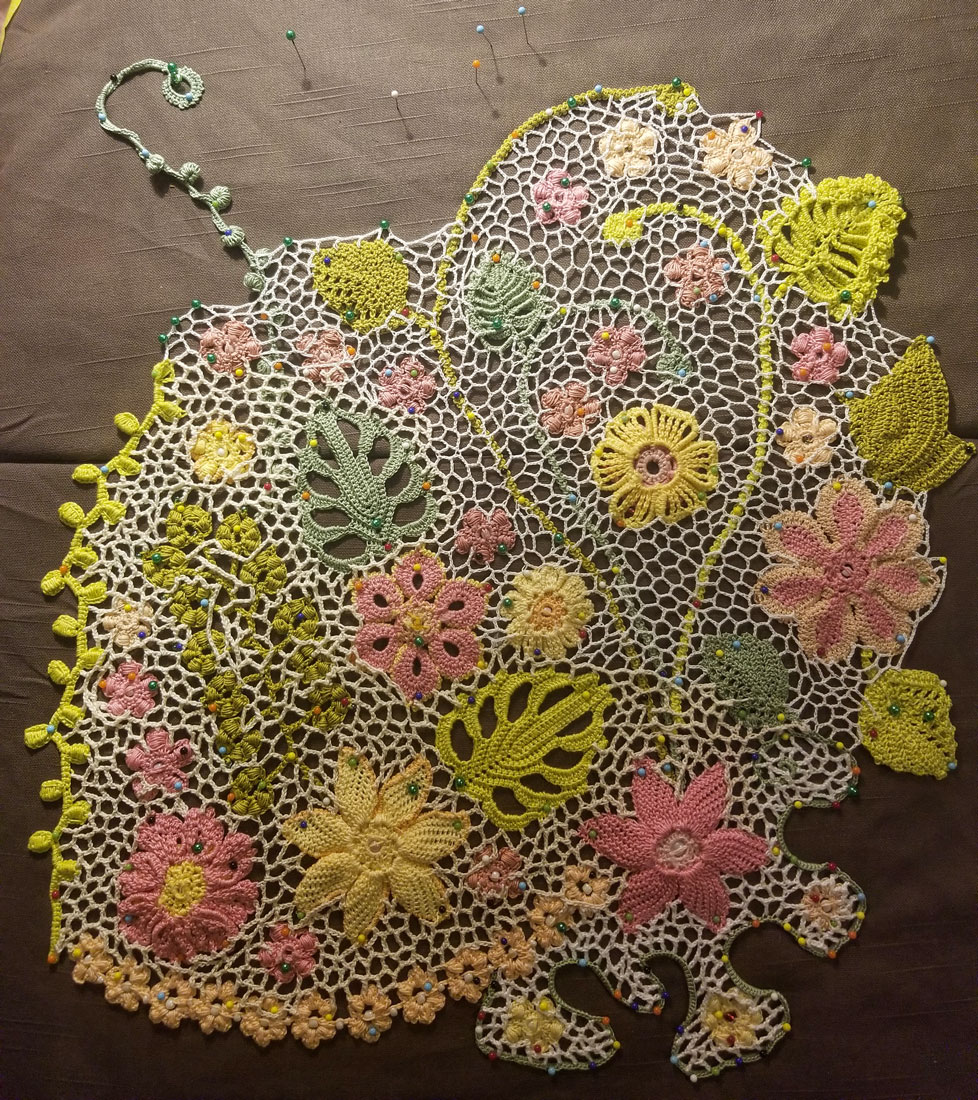 The flowers and leaves were mostly done after crochet-along videos again in Russian, by Elena Rugal and perhaps some others, along with some improvisation. In the last image, you can see the first step of creating the webbing with pinned down cord that follows the lines drawn on paper. It is also evident that I did not sketch out the whole design at this point, I designed as I went along, instead of blocking everything in at the beginning – it’s just the way I like to work when that option is viable for the project. This process continues and expands as I pin down more cords and flowers and crochet the webbing between them, like the spider.
