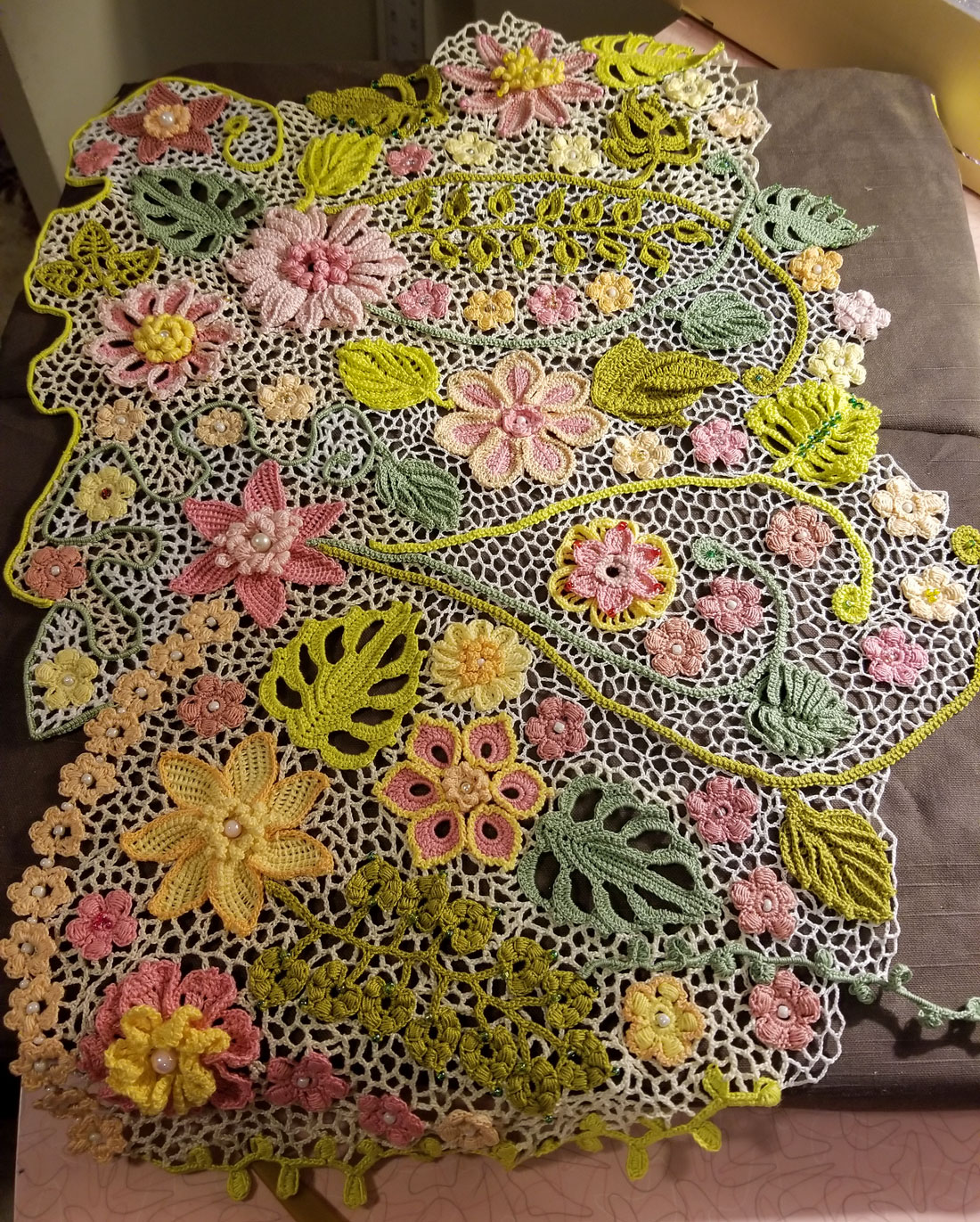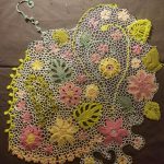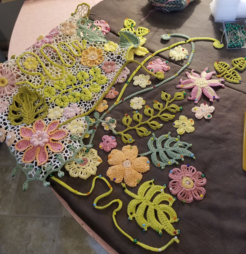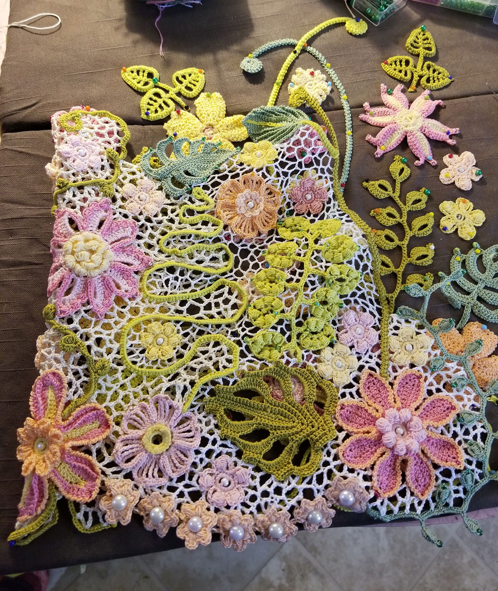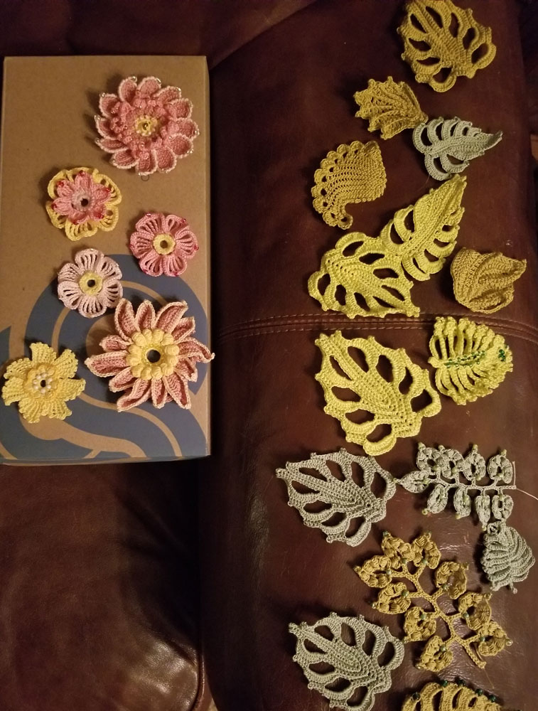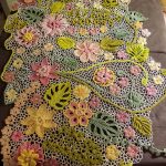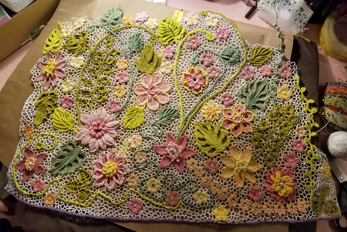 The flowers and leaves were mostly done after crochet-along videos again in Russian, by Elena Rugal and perhaps some others, along with some improvisation. In the last image, you can see the first step of creating the webbing with pinned down cord that follows the lines drawn on paper. It is also evident that I did not sketch out the whole design at this point, I designed as I went along, instead of blocking everything in at the beginning – it’s just the way I like to work when that option is viable for the project. This process continues and expands as I pin down more cords and flowers and crochet the webbing between them, like the spider.