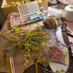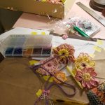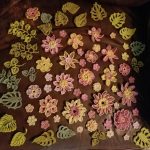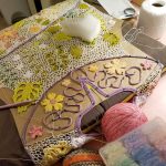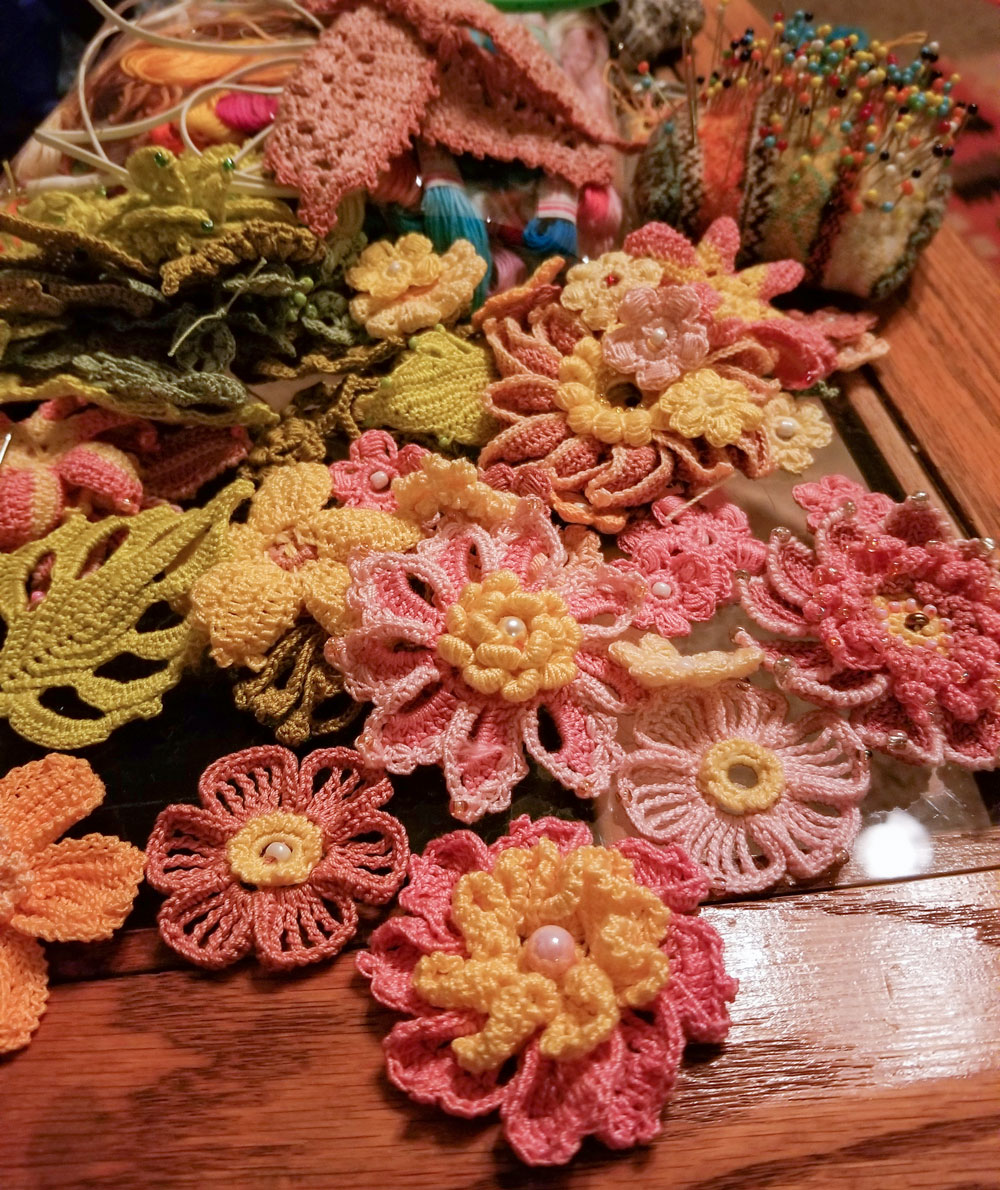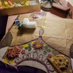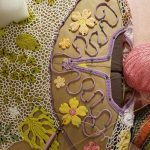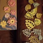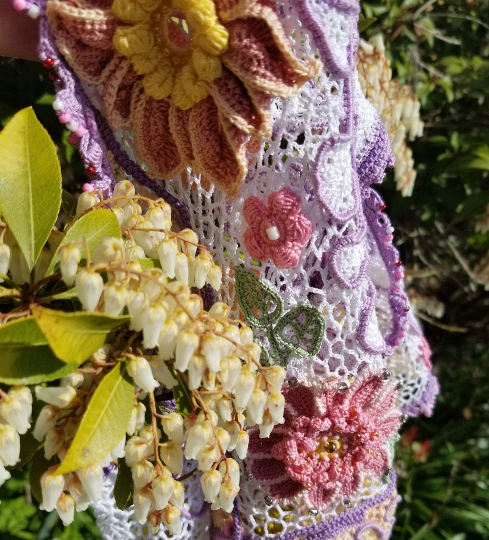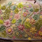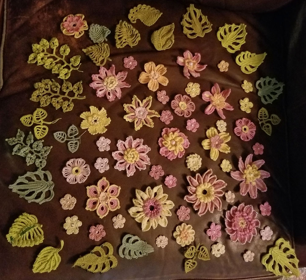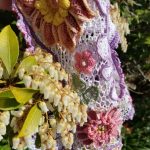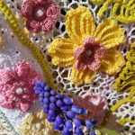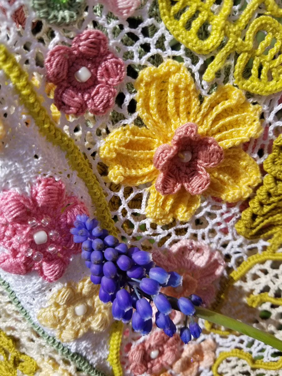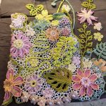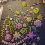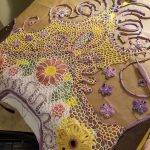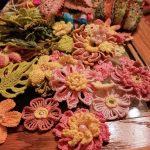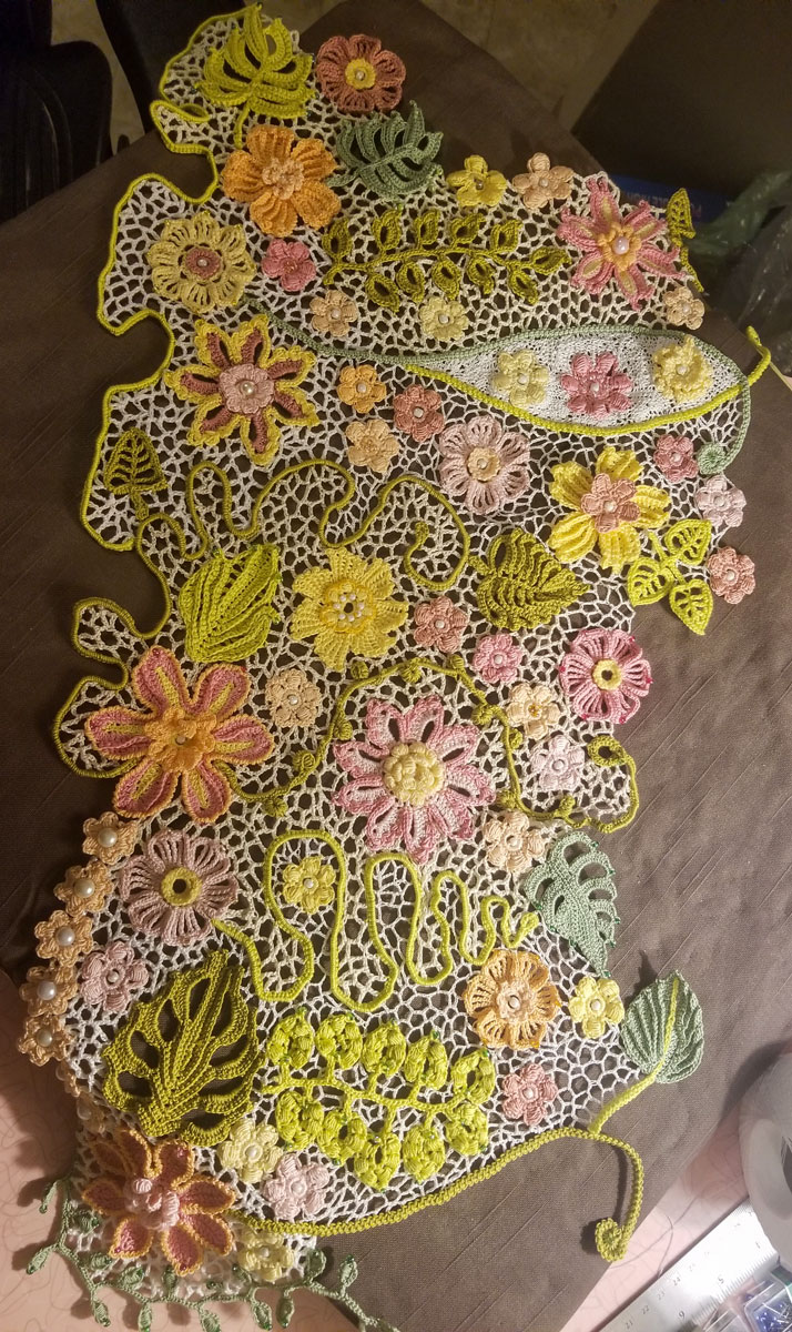 The flowers and leaves were mostly done after crochet-along videos again in Russian, by Elena Rugal and perhaps some others, along with some improvisation. In the last image, you can see the first step of creating the webbing with pinned down cord that follows the lines drawn on paper. It is also evident that I did not sketch out the whole design at this point, I designed as I went along, instead of blocking everything in at the beginning – it’s just the way I like to work when that option is viable for the project. This process continues and expands as I pin down more cords and flowers and crochet the webbing between them, like the spider.
