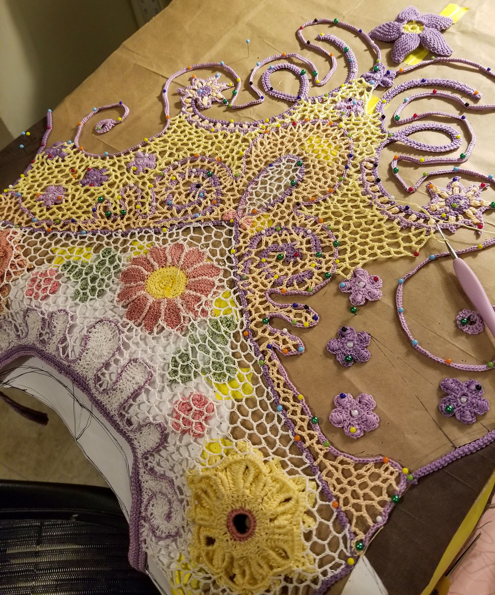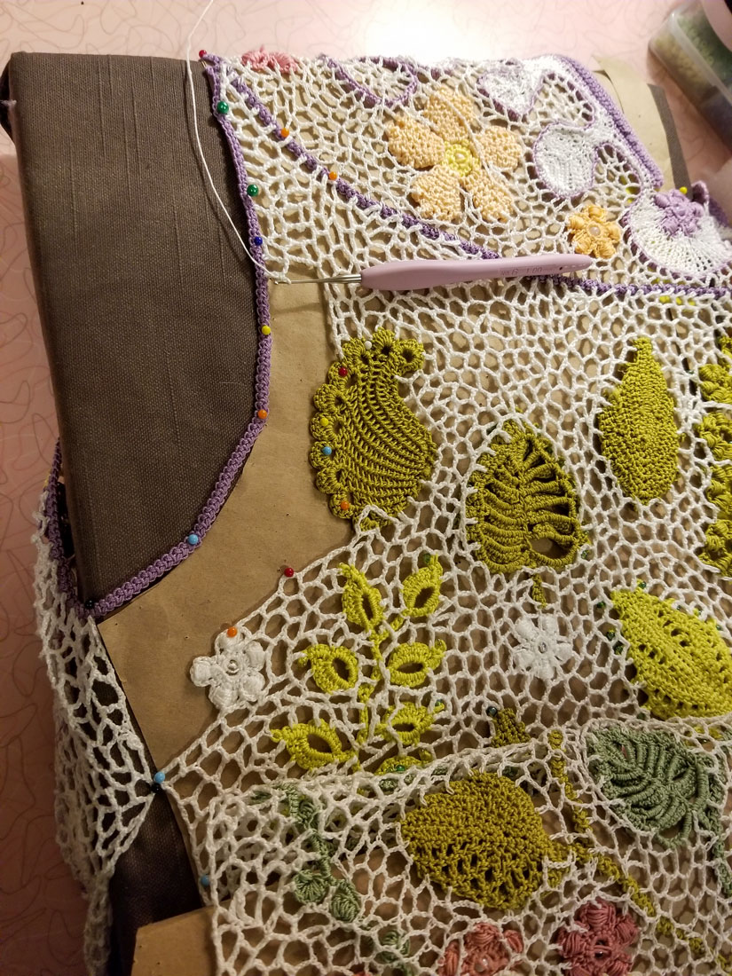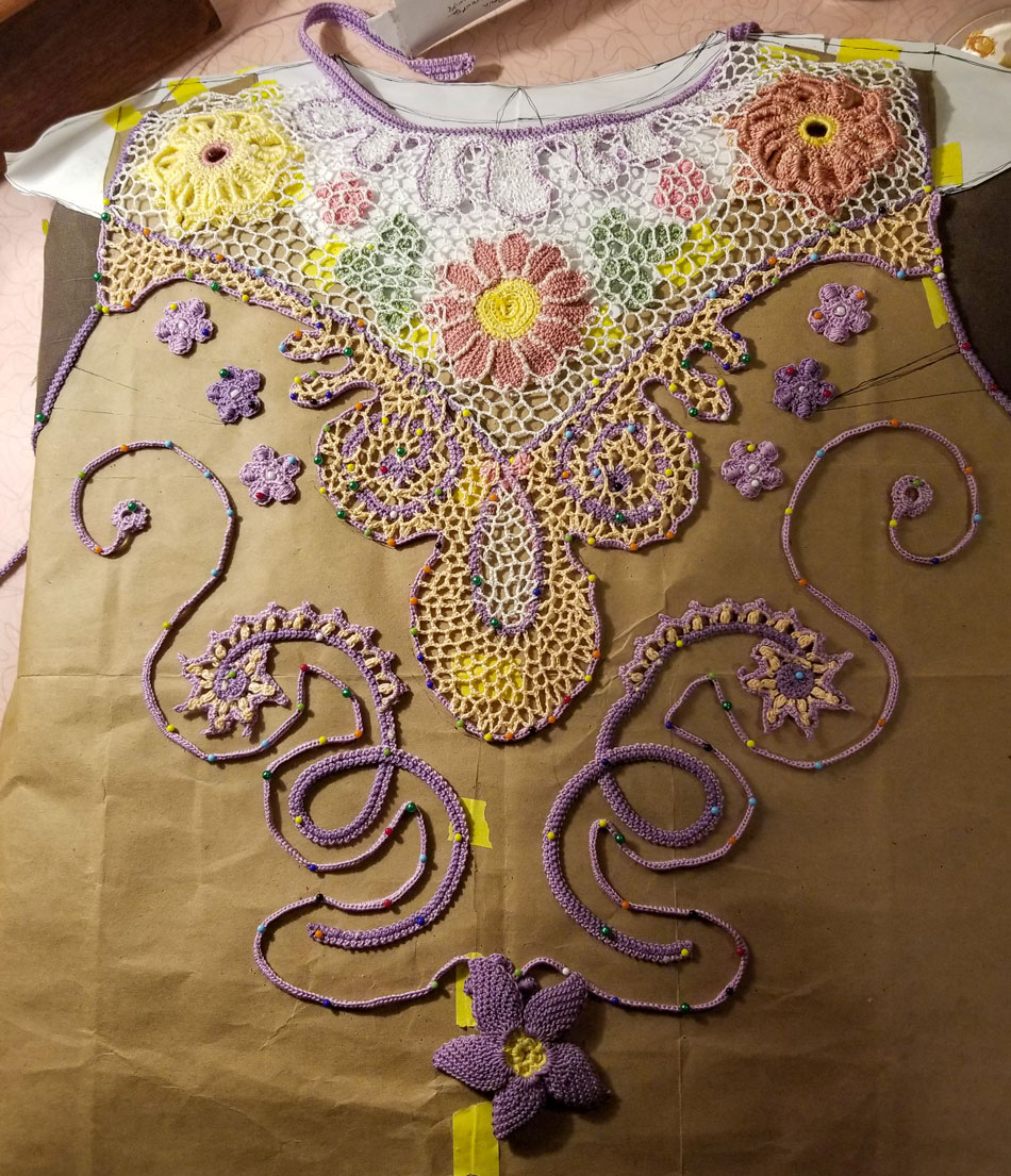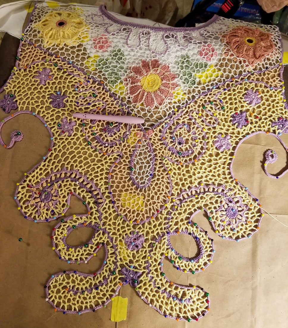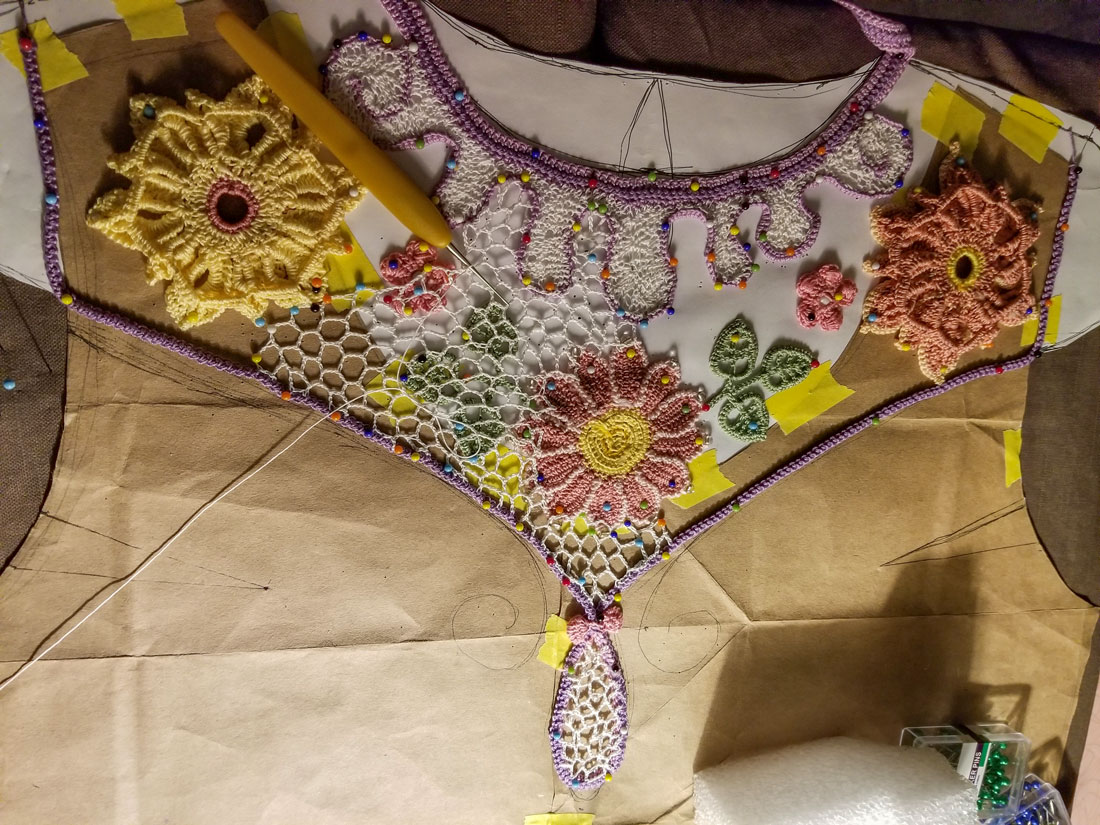 The above images show how the top section of the front side was made. The motifs were pinned facing down, so that I had a better access to the parts of them where I connect the web to. The goal is to achieve the look of web being underneath the motifs, even though it doesn’t reach in there, but at least connection points should not be readily visible. The last image shows the completed section, unpinned from the cushion, with right side up. The reason I made this dress in sections is that the cushion wasn’t very large – it consists of two rectangular pieces of packaging foam wrapped in fabric and joined together – and I didn’t want it larger, since it is easier to turn it around as I work and doesn’t require a large work area. Pinning completed section down again is needed only when it is joined with another section.