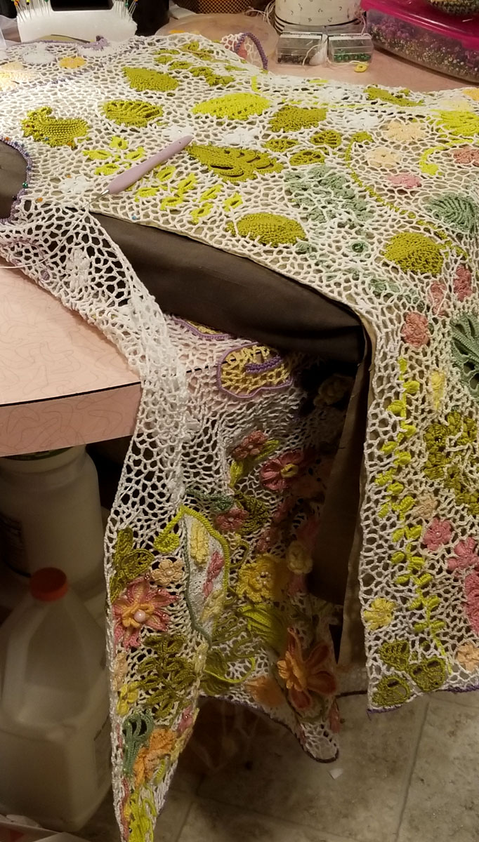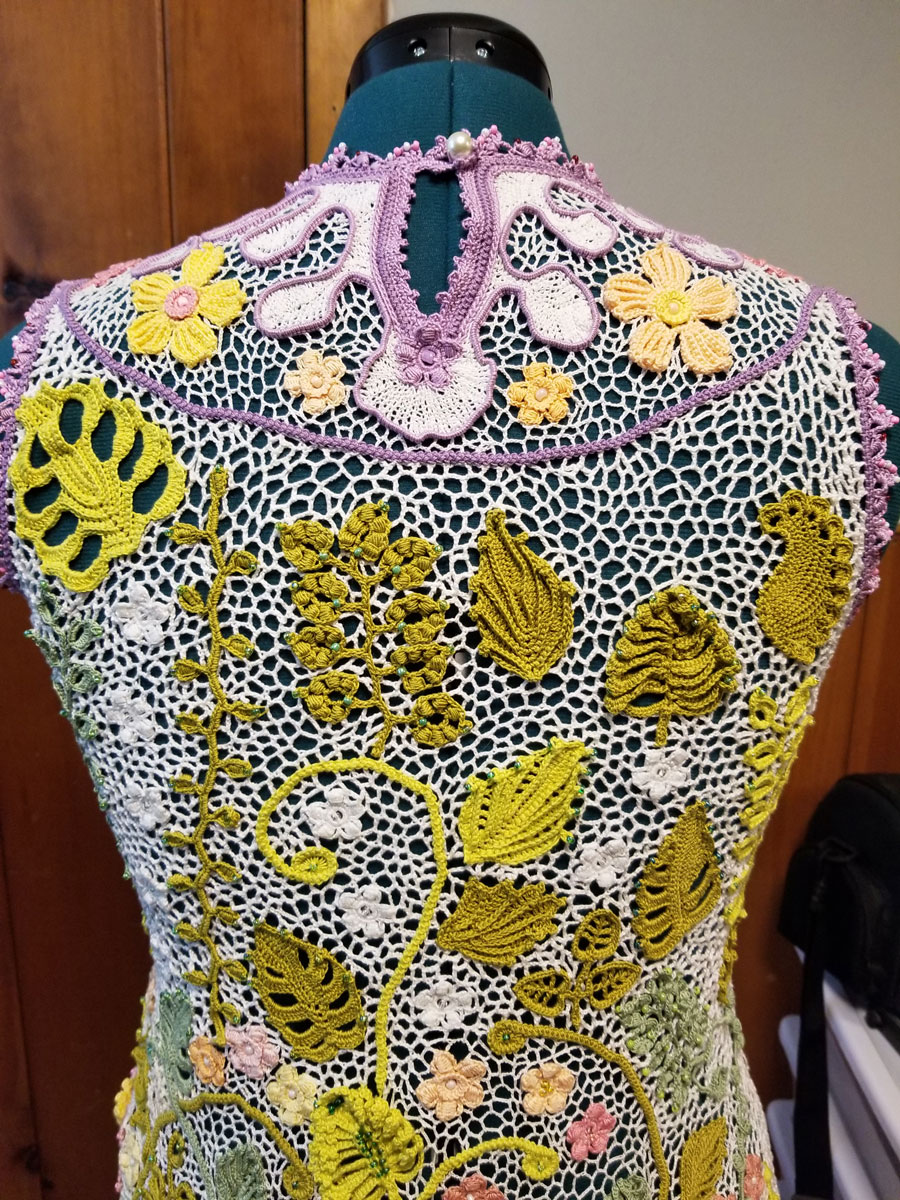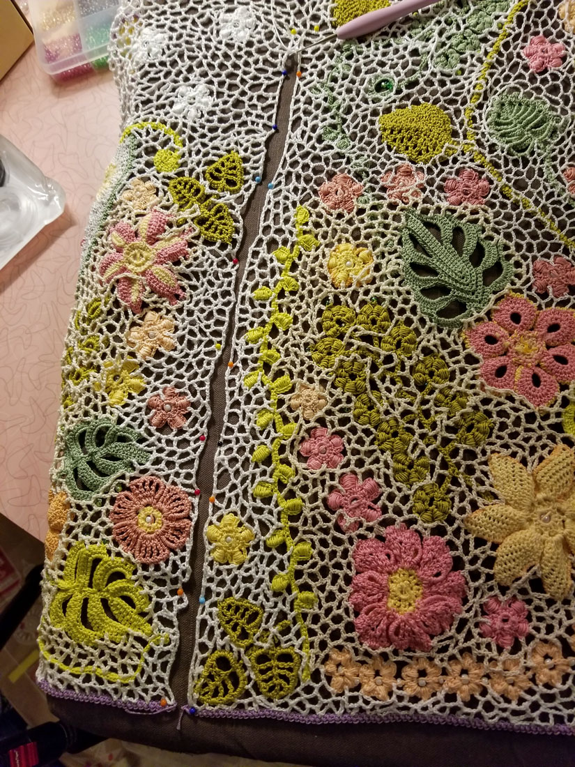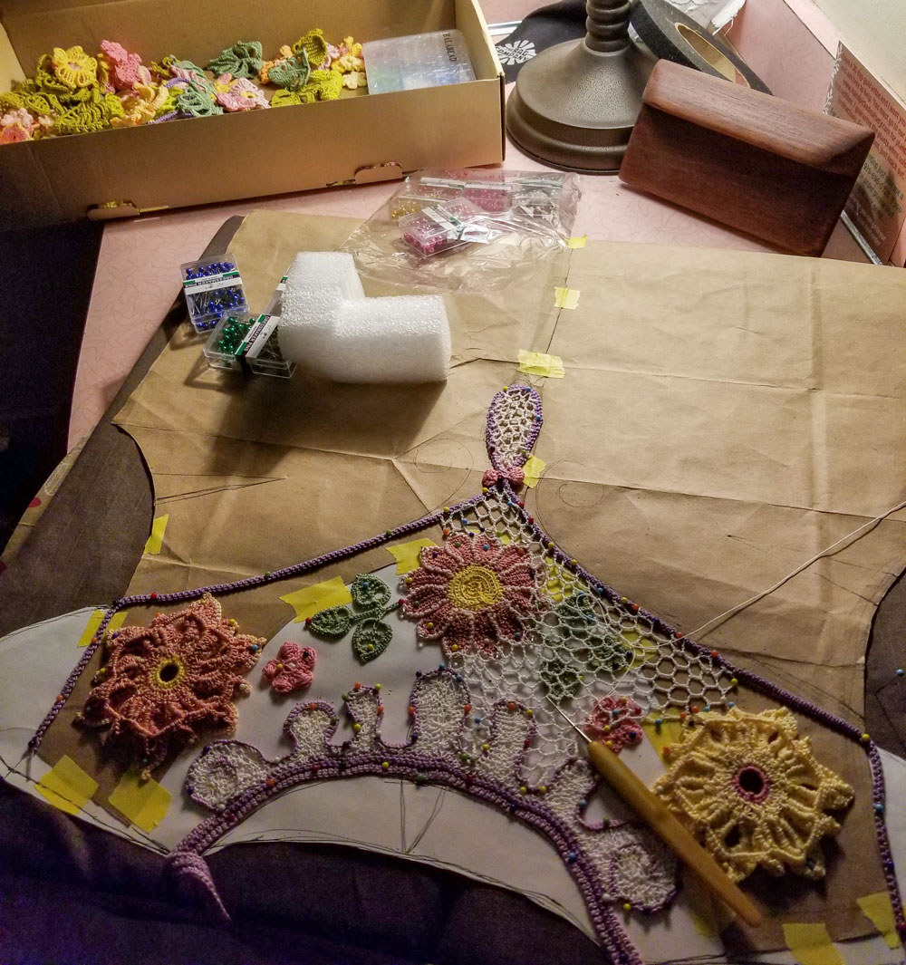 The above images show how the top section of the front side was made. The motifs were pinned facing down, so that I had a better access to the parts of them where I connect the web to. The goal is to achieve the look of web being underneath the motifs, even though it doesn’t reach in there, but at least connection points should not be readily visible. The last image shows the completed section, unpinned from the cushion, with right side up. The reason I made this dress in sections is that the cushion wasn’t very large – it consists of two rectangular pieces of packaging foam wrapped in fabric and joined together – and I didn’t want it larger, since it is easier to turn it around as I work and doesn’t require a large work area. Pinning completed section down again is needed only when it is joined with another section.
