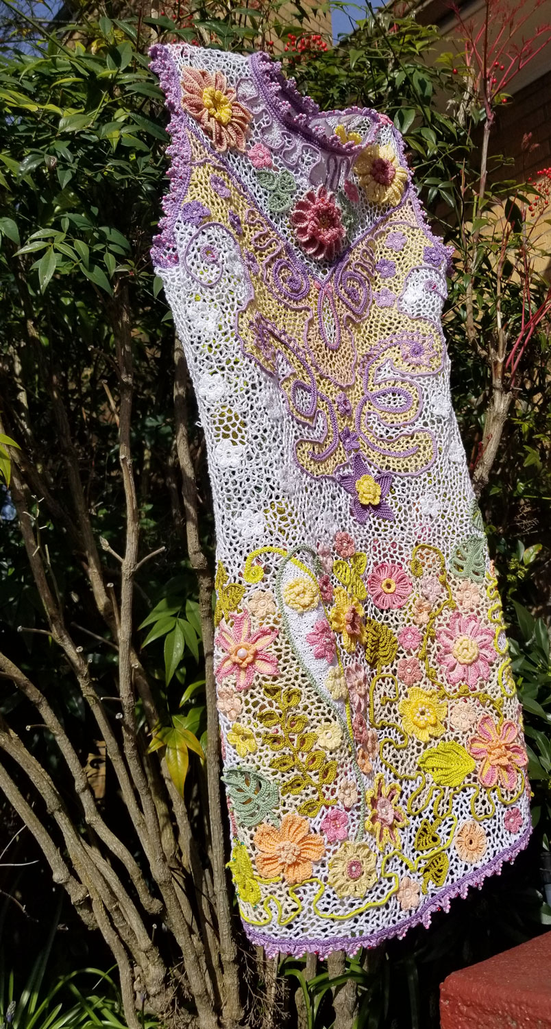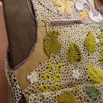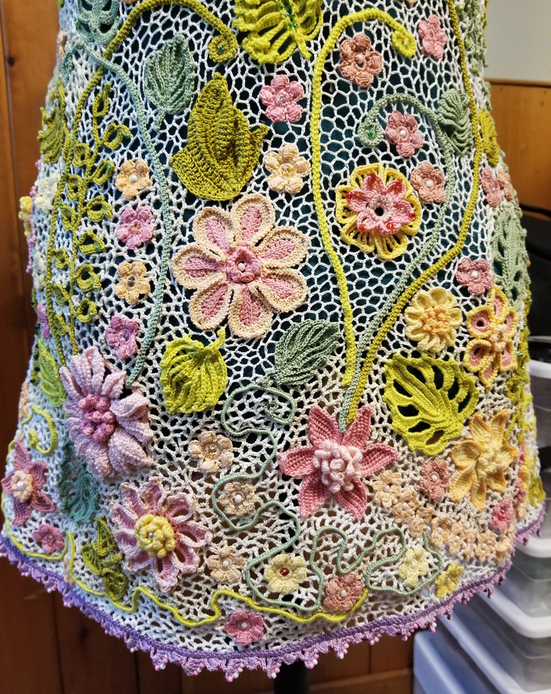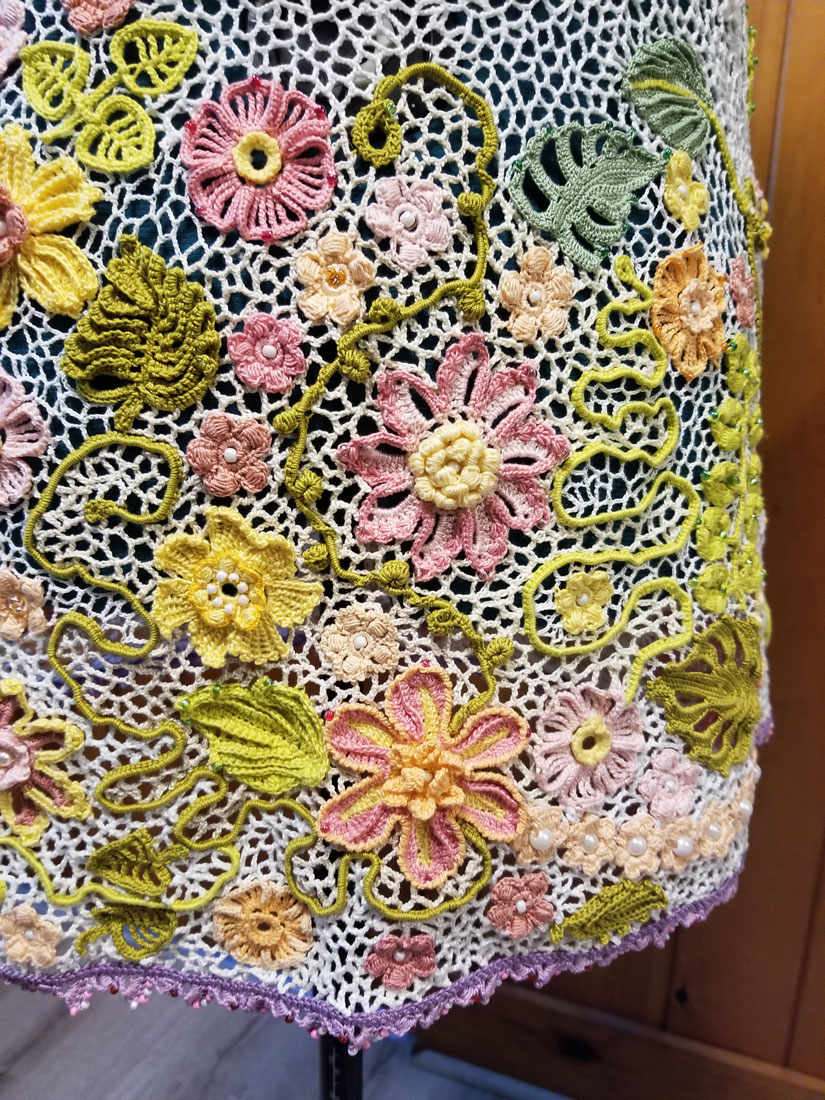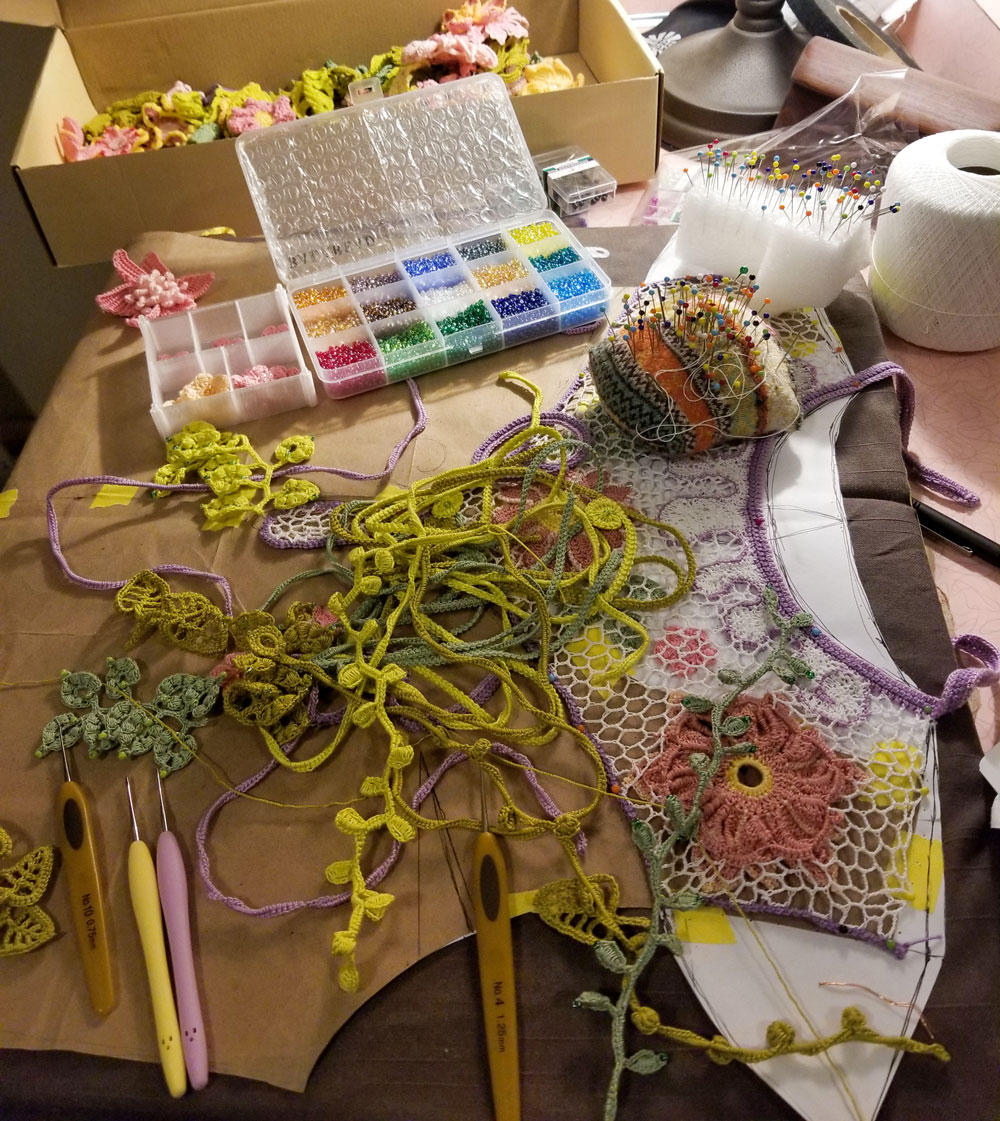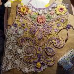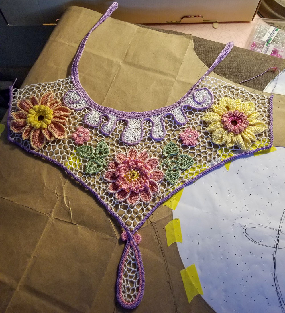 The above images show how the top section of the front side was made. The motifs were pinned facing down, so that I had a better access to the parts of them where I connect the web to. The goal is to achieve the look of web being underneath the motifs, even though it doesn’t reach in there, but at least connection points should not be readily visible. The last image shows the completed section, unpinned from the cushion, with right side up. The reason I made this dress in sections is that the cushion wasn’t very large – it consists of two rectangular pieces of packaging foam wrapped in fabric and joined together – and I didn’t want it larger, since it is easier to turn it around as I work and doesn’t require a large work area. Pinning completed section down again is needed only when it is joined with another section.