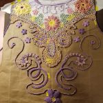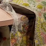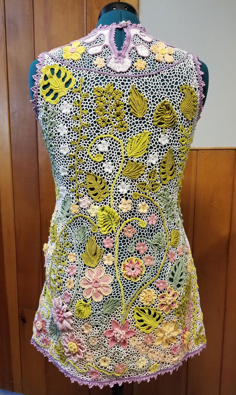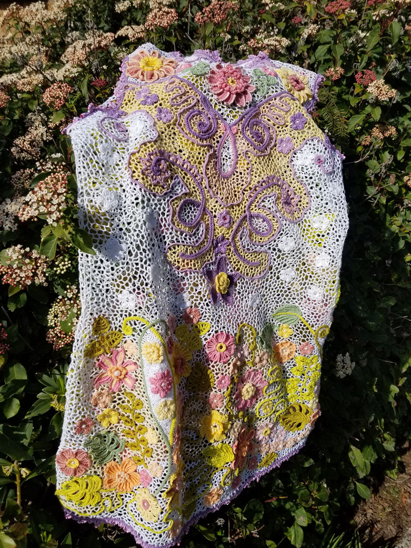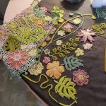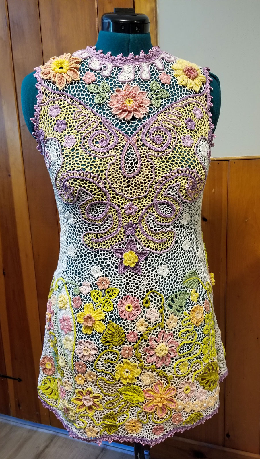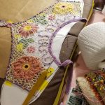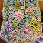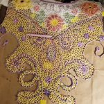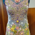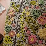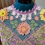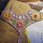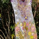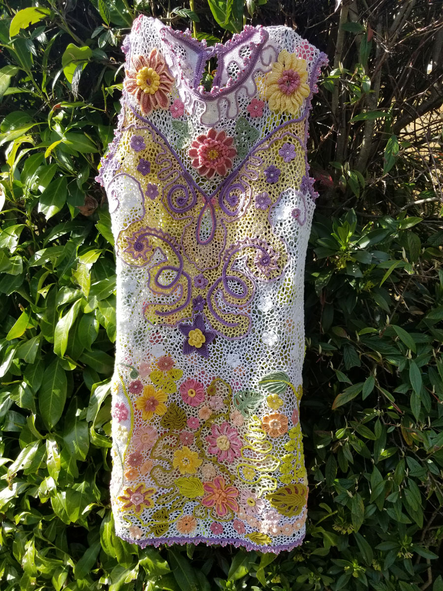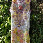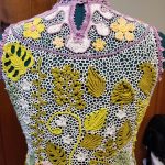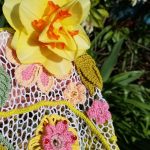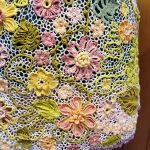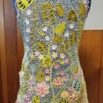 The above images show how the top section of the front side was made. The motifs were pinned facing down, so that I had a better access to the parts of them where I connect the web to. The goal is to achieve the look of web being underneath the motifs, even though it doesn’t reach in there, but at least connection points should not be readily visible. The last image shows the completed section, unpinned from the cushion, with right side up. The reason I made this dress in sections is that the cushion wasn’t very large – it consists of two rectangular pieces of packaging foam wrapped in fabric and joined together – and I didn’t want it larger, since it is easier to turn it around as I work and doesn’t require a large work area. Pinning completed section down again is needed only when it is joined with another section.