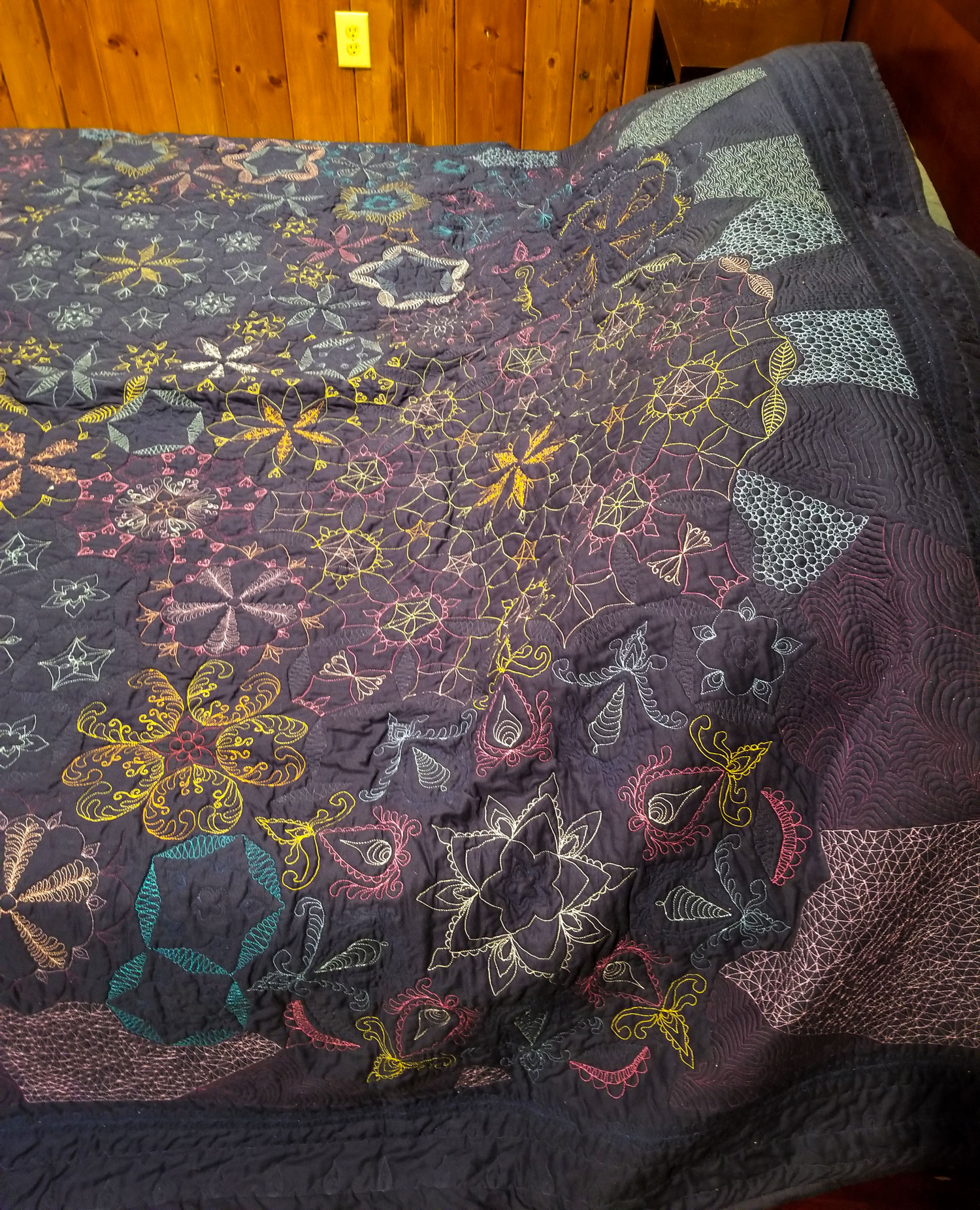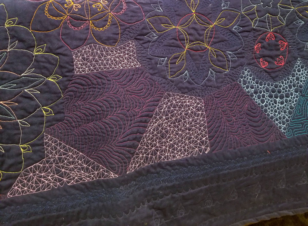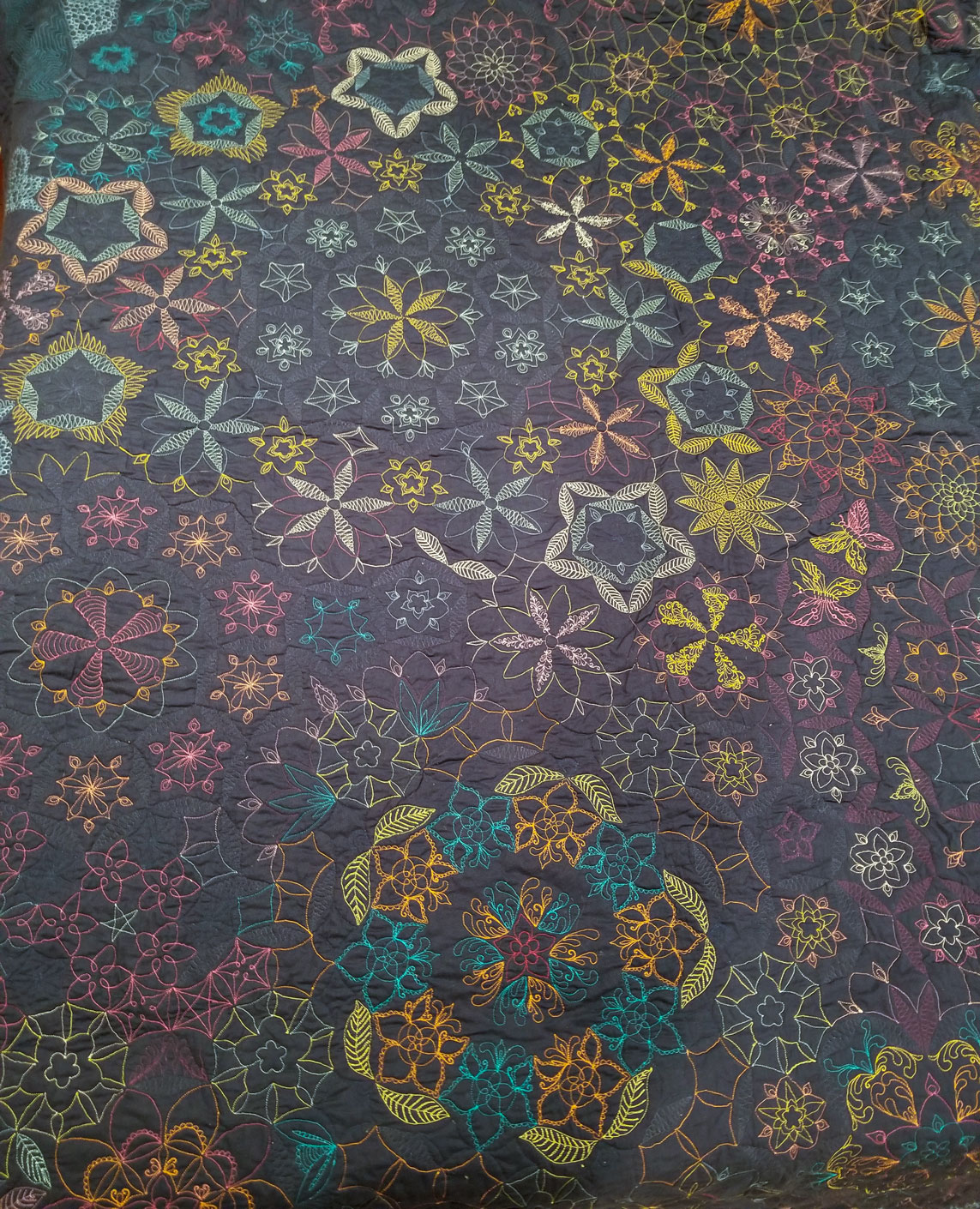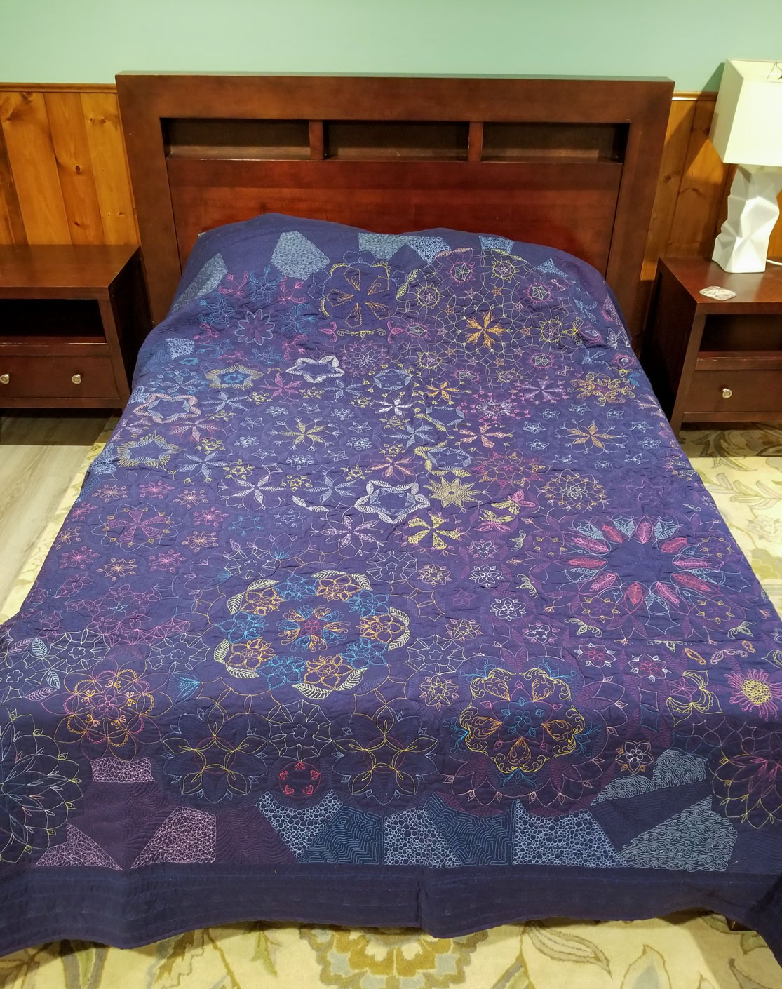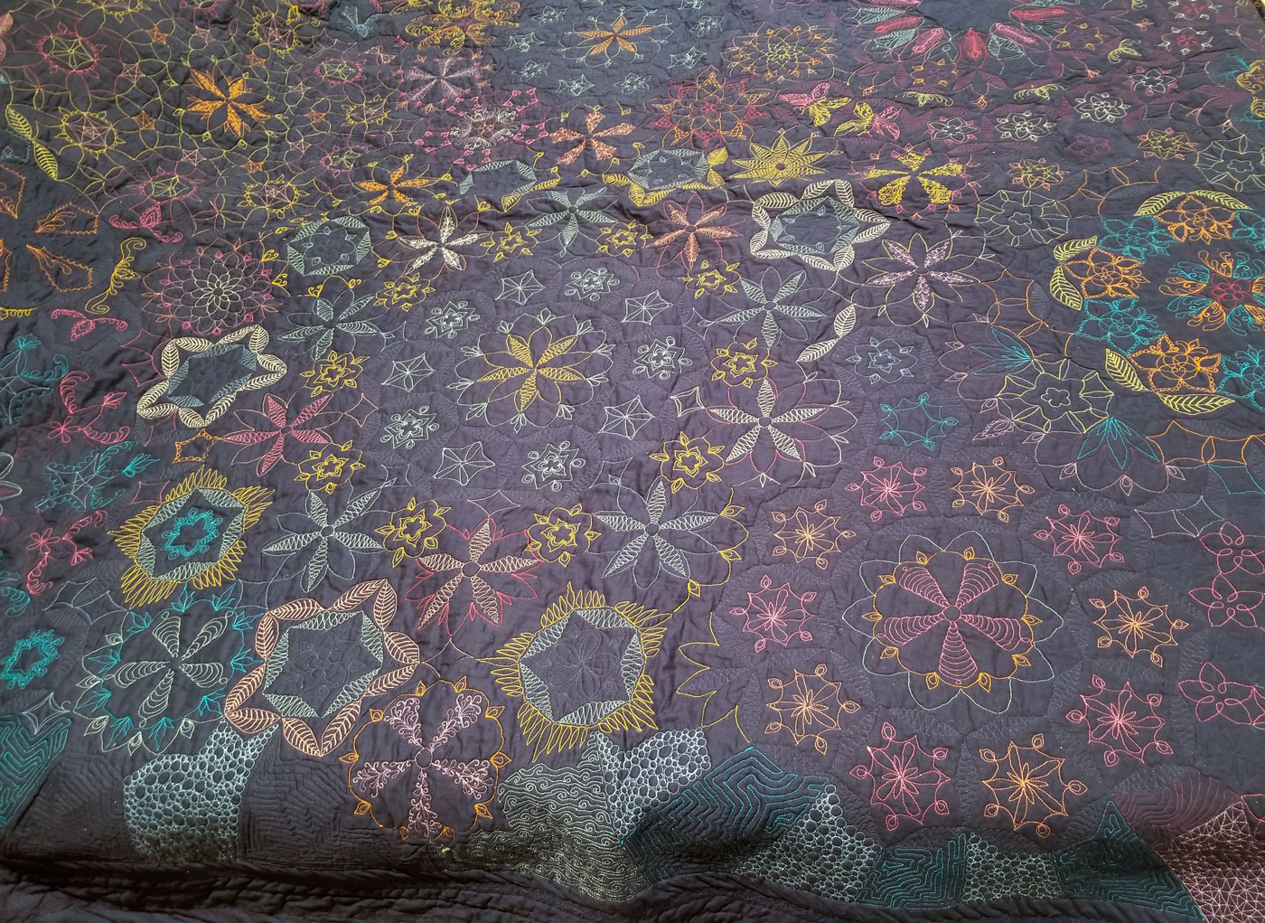 This hand pieced and free motion quilted blanket took me almost a whole year to make. It is queen sized, and I simply didn’t have a good place to take a picture of it. That’s the main reason why I haven’t posted this, even though it was completed over two years ago. The full shot of the completed quilt seen above had a bit of a corner and the edge reconstructed in Photoshop, and despite that still didn’t fit in the frame, even though I had my phone held up against the ceiling, while standing on the bar stool to take a picture of the quilt spread on the floor.