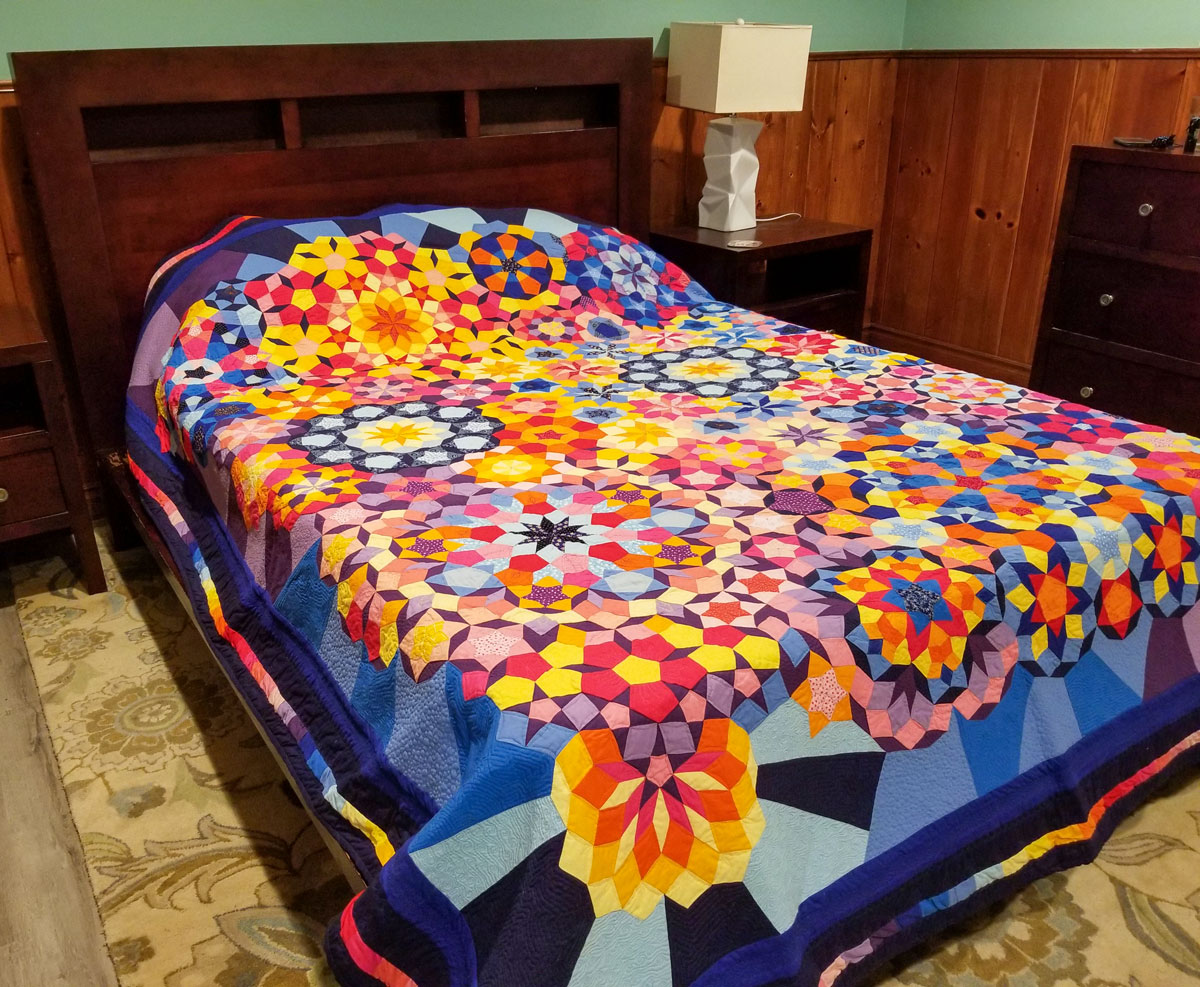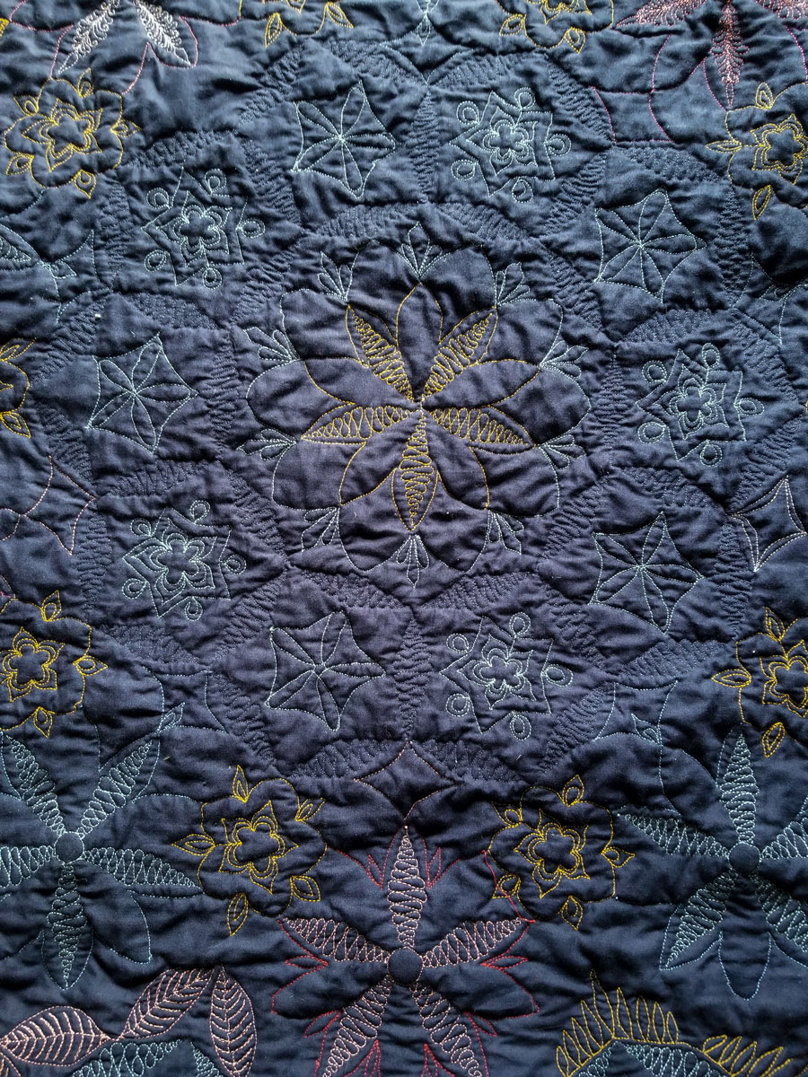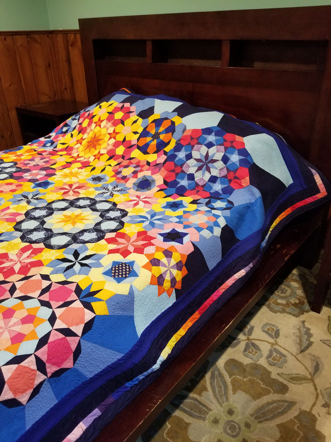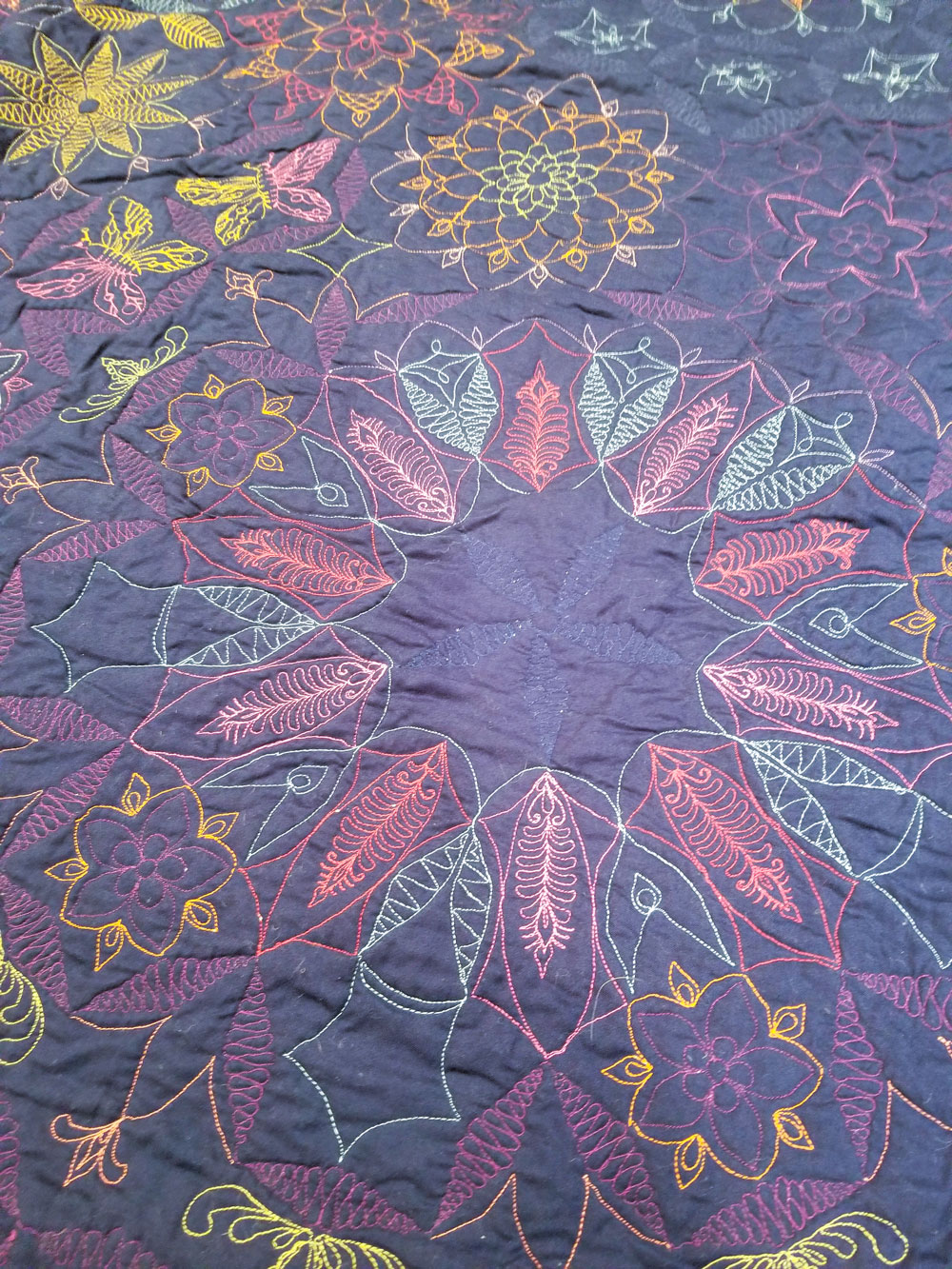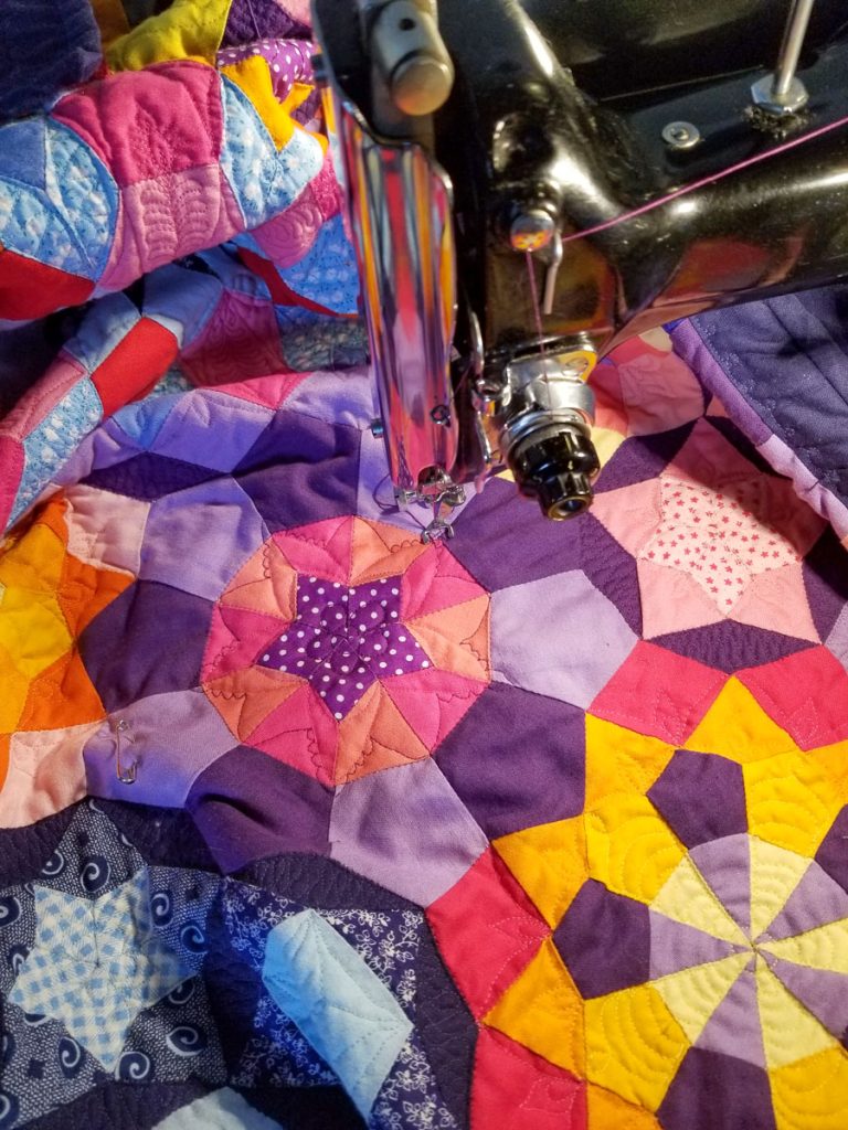 This hand pieced and free motion quilted blanket took me almost a whole year to make. It is queen sized, and I simply didn’t have a good place to take a picture of it. That’s the main reason why I haven’t posted this, even though it was completed over two years ago. The full shot of the completed quilt seen above had a bit of a corner and the edge reconstructed in Photoshop, and despite that still didn’t fit in the frame, even though I had my phone held up against the ceiling, while standing on the bar stool to take a picture of the quilt spread on the floor.