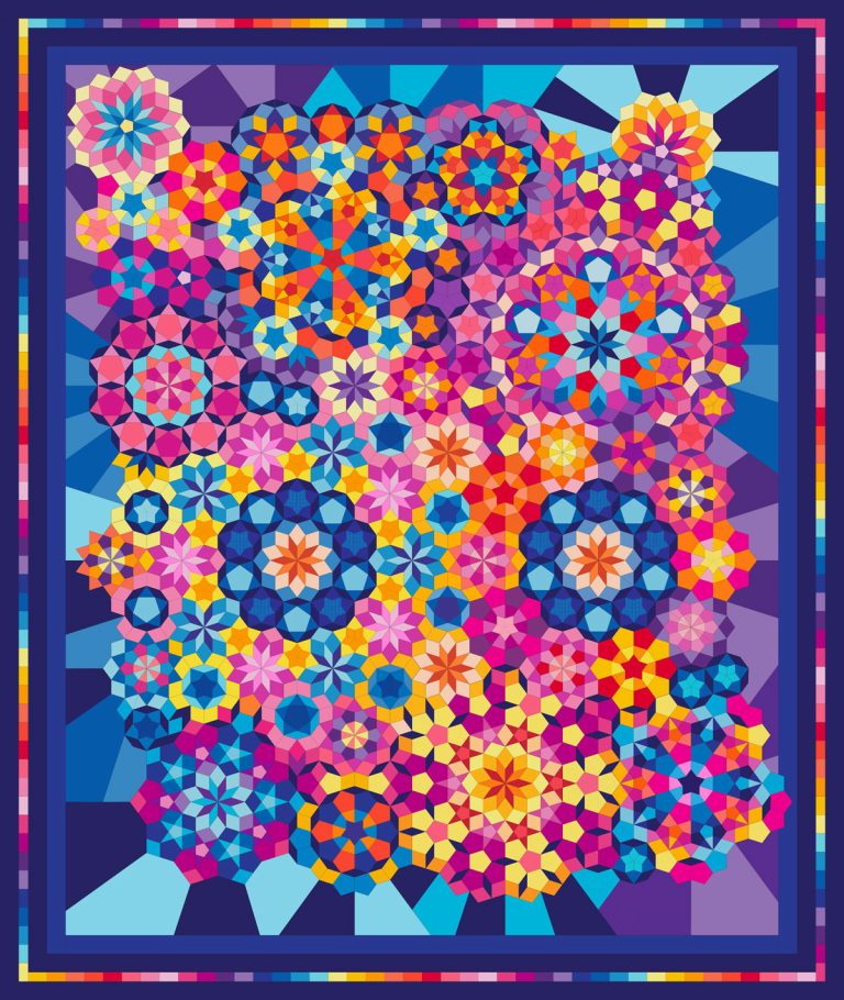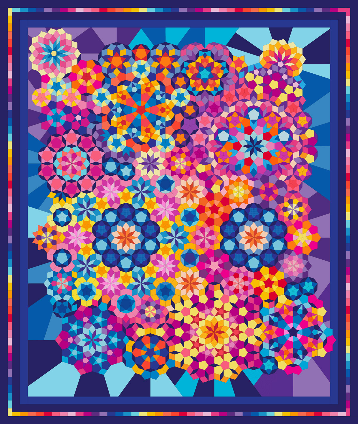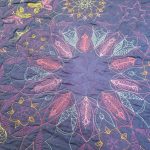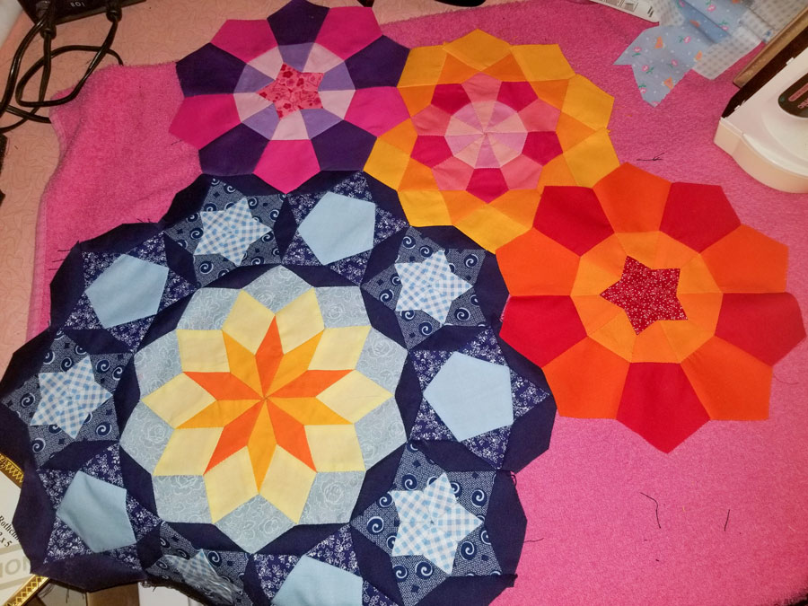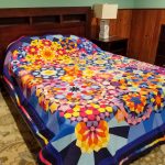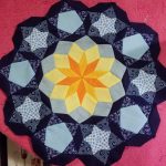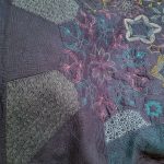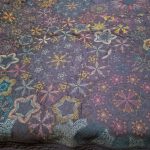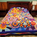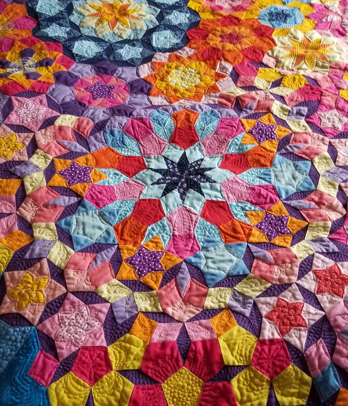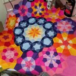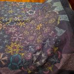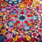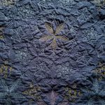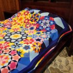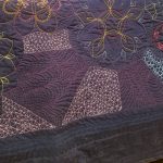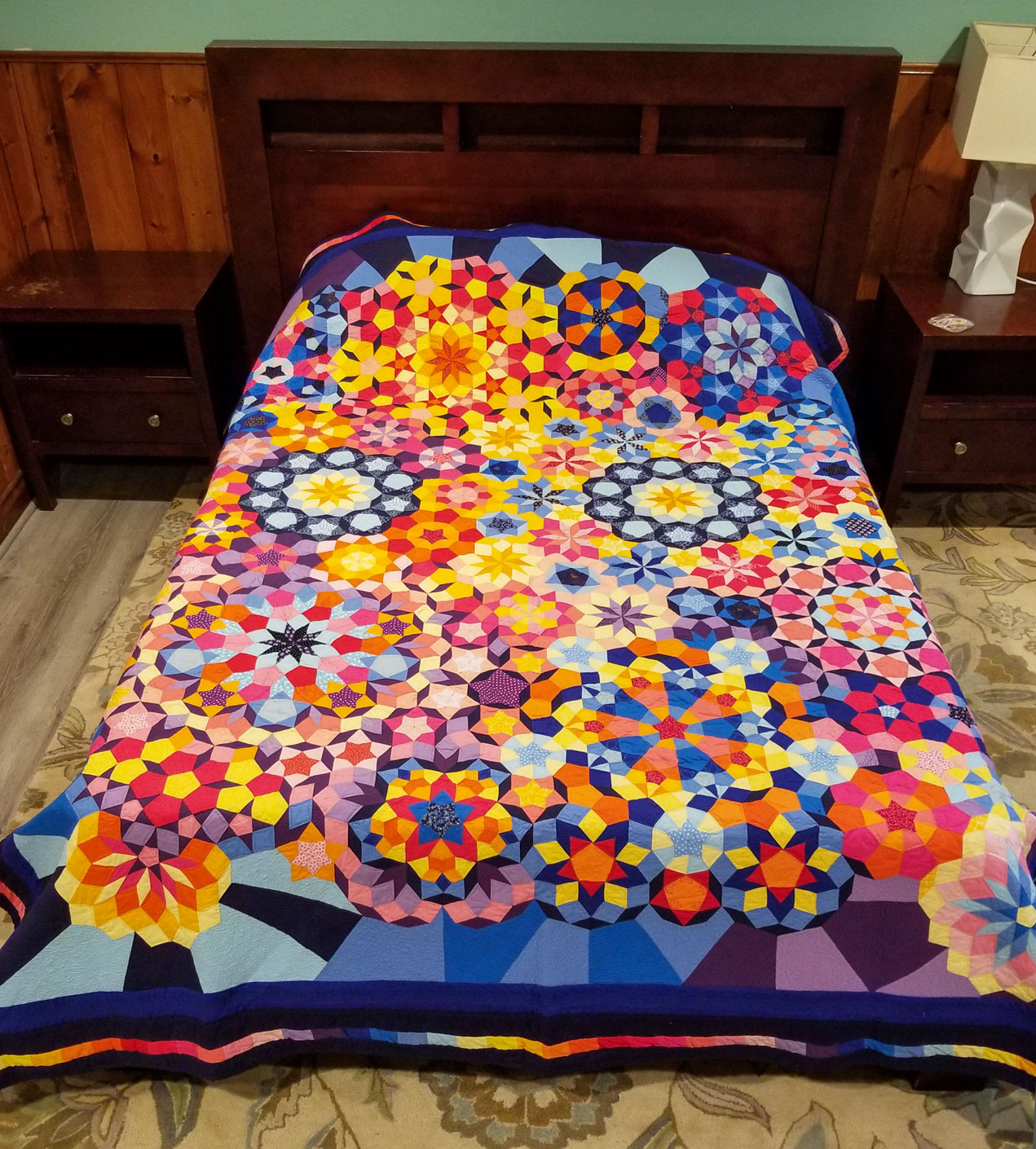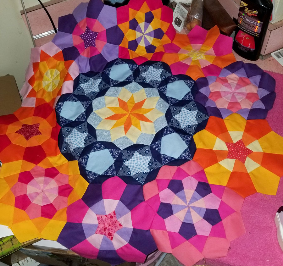 This hand pieced and free motion quilted blanket took me almost a whole year to make. It is queen sized, and I simply didn’t have a good place to take a picture of it. That’s the main reason why I haven’t posted this, even though it was completed over two years ago. The full shot of the completed quilt seen above had a bit of a corner and the edge reconstructed in Photoshop, and despite that still didn’t fit in the frame, even though I had my phone held up against the ceiling, while standing on the bar stool to take a picture of the quilt spread on the floor.