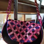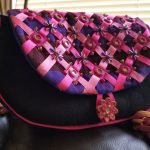 After the print was done, I used a blade to cut the tulle inside the slits in 3D printed squares, and took pink and magenta ribbons and ran them through the slits, so that they went under the 3D print. Then, I had to finalize the pattern for the bag, and I originally thought of making just a zippered pouch, but got inspired to do something more elaborate – a purse with a strap. The decorated flap was originally continuous with the back part, but after I thought through the sewing process I realized that this bag will have to be made just like the backpacks, where flap is made separately and added to the bag during final assembling of main body of the bag and the lining. The bag shape changed as a result of reworking the pattern, so that the front and back piece were now wider on the bottom. I was happy with this look, so I went to work. First, I took the print with ribbons and sewn it onto the flap that was made in black and blue strips. I used embroidery floss and by hand stitched in beads at every concave corner of the printed squares, as well as the intersections of the ribbons.