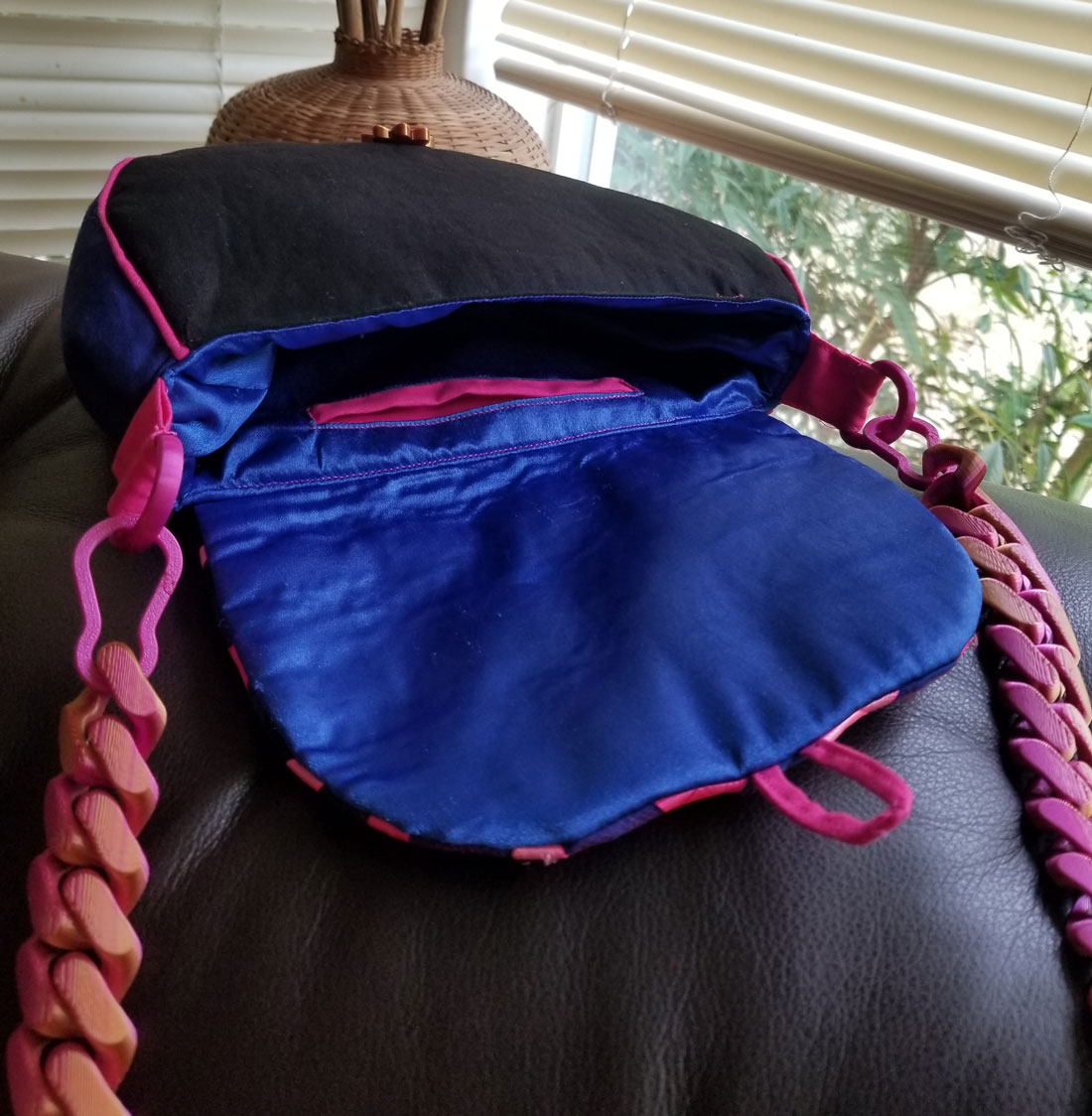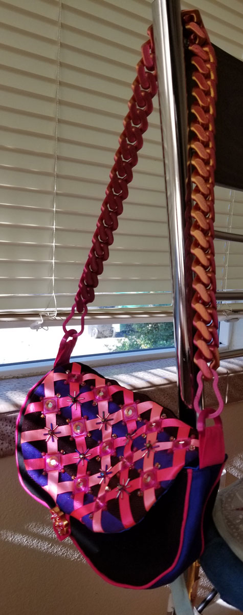 After the print was done, I used a blade to cut the tulle inside the slits in 3D printed squares, and took pink and magenta ribbons and ran them through the slits, so that they went under the 3D print. Then, I had to finalize the pattern for the bag, and I originally thought of making just a zippered pouch, but got inspired to do something more elaborate – a purse with a strap. The decorated flap was originally continuous with the back part, but after I thought through the sewing process I realized that this bag will have to be made just like the backpacks, where flap is made separately and added to the bag during final assembling of main body of the bag and the lining. The bag shape changed as a result of reworking the pattern, so that the front and back piece were now wider on the bottom. I was happy with this look, so I went to work. First, I took the print with ribbons and sewn it onto the flap that was made in black and blue strips. I used embroidery floss and by hand stitched in beads at every concave corner of the printed squares, as well as the intersections of the ribbons.